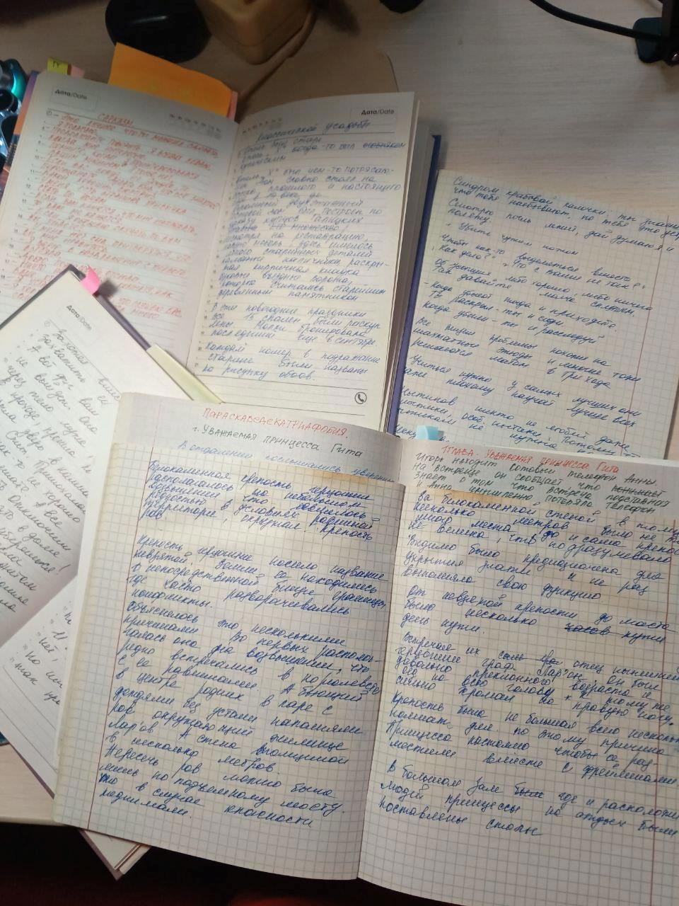 Обычно, когда с очередной историей я попадаю в затык и не знаю, что будет дальше, то беру тетрадь и пишу от руки. В мозгу словно что-то переключается и я снова в деле. За то время. что я на АТ их накопилось немало. Помимо прочего есть ещё и ежедневники, где я фиксирую сюжеты ненаписанных историй.