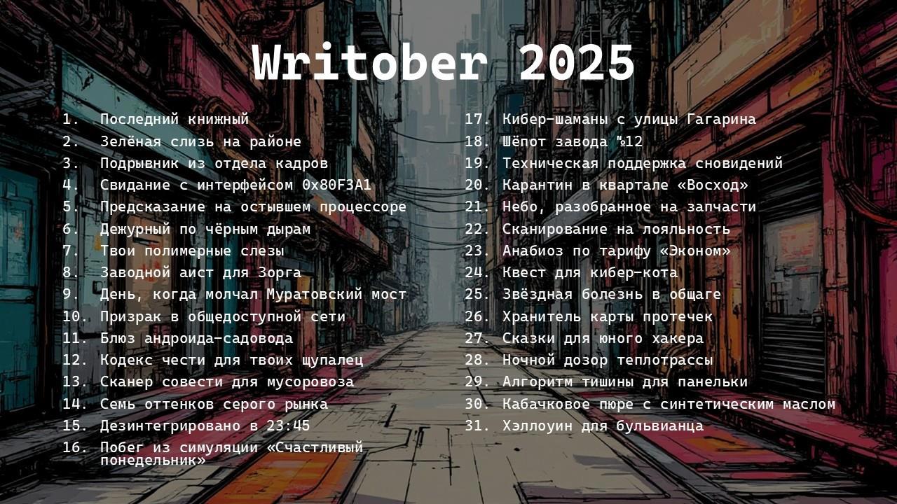 Автор: Мария ГарибальдиСегодняшним вечером, прямо накануне челленджа, я всё-таки решила добавить в свою жизнь приключений и вписалась в "Writober 2025". Буду целый месяц писать по рассказу в день.