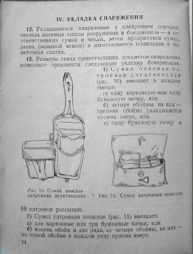 3. Имеющиеся патронные сумки, изготовленные из брезента, весьма непрактичны. При личной проверке одного отделения бойцов можно было видеть, как после заряжания (в положении лежа) и последующей перебежки на 30–40 м, бойцы теряли из патронной сумки до половины патронов.»
