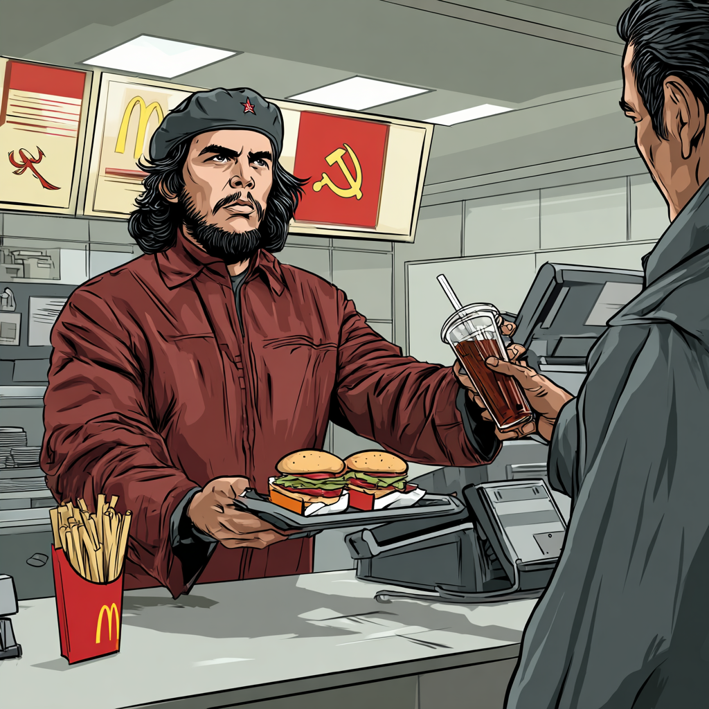 Конечно, изменилось далеко не всё. Стремление к экономии осталось, и поэтому в подсобке Алексей нашёл те же самые тряпки, что не так давно стирал и вешал на верёвочку. Но, взяв одну из них и подойдя к прилавку, чтобы, как обычно, протереть его от пыли, коей не имелось, он увидел, что меню переработано. И начальству надо отдать должное: «cheбургера» там не было. Пинков и его Ко, как оказалось, обладали более живым воображением и не взяли этого названия, сочинённого до них. Зато в меню возникли «Партизанский», «Подрывник» и «Трудовой» – салаты, сэндвич «Двойной Робеспьер» и Фак-Кола. Все пиццы имели названия насквозь нецензурные: видимо, это должно было стать необычной и смелой приманкой. «Шварцвальдская вишня», «Медовый орешек» и прочие торты пошли в общем стиле, став «Жирным буржуем» и «Эксплуататорской кровью». А чая не стало. Его заменил матэ, любимый напиток Че Гевары. Конечно, в пакетиках.