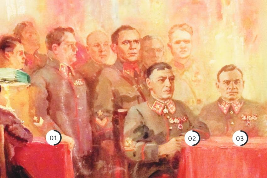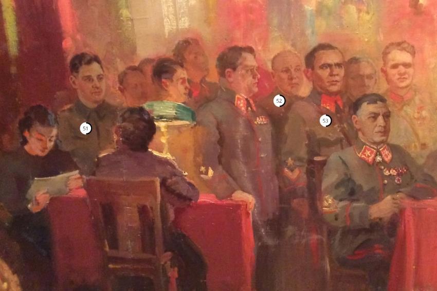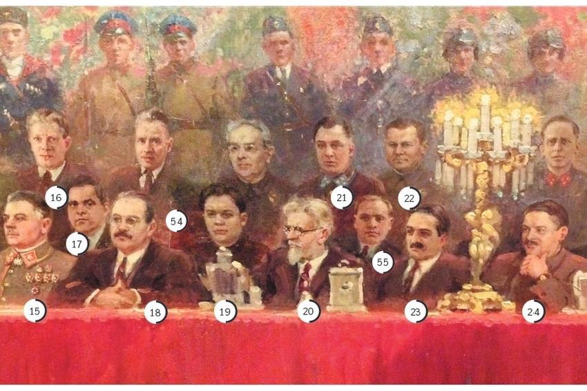 53. Павел Иванович Бодин (1900-1942). Генерал-лейтенант. С марта по август 1942 - Второй заместитель начальника Генерального штаба, с апреля 1942 по совместительству - начальник Оперативного управления Генерального штаба, одновременно в июне-июле 1942, находясь в служебной командировке, исполнял обязанности начальника штаба Юго-Западного и Сталинградского фронтов; в августе-ноябре 1942 - начальник штаба Закавказского фронта. Изображение генерала Бодина на монументальном полотне - один из многочисленных мифов, созданных А.М.Герасимовым. 2 ноября Бодин погиб в бою. Похоронен в Тбилиси.