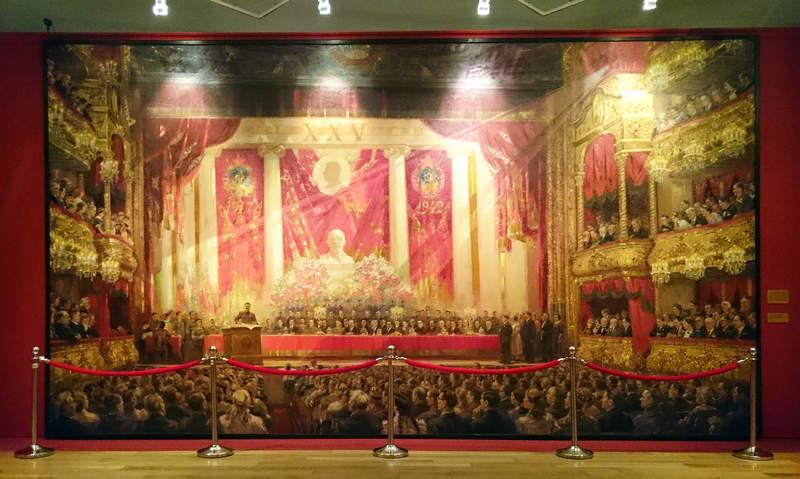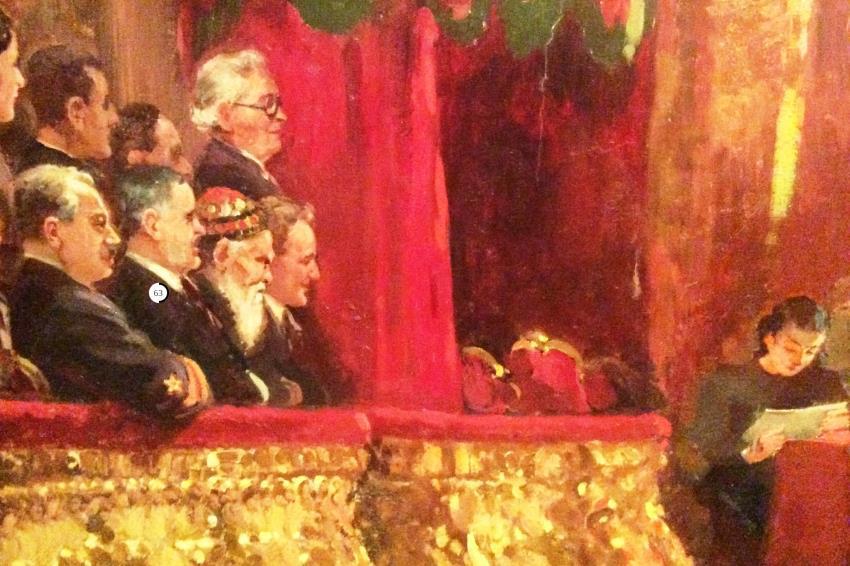 Шел 1942 год, один из тяжелейших периодов Великой Отечественной войны, и тогда сами понимаете, было не до торжественных заседаний. Но к 25й годовщине, Октябрьской революции, художник Александр Герасимов заранее создал монументальное эпическое полотно (размером 406х710 см). Мастер изобразил в интерьере Большого театра, более 200 партийных деятелей, ученых, писателей, деятелей культуры и искусства (себя естественно тоже не забыл изобразить). Картина называлась "Гимн Октябрю".