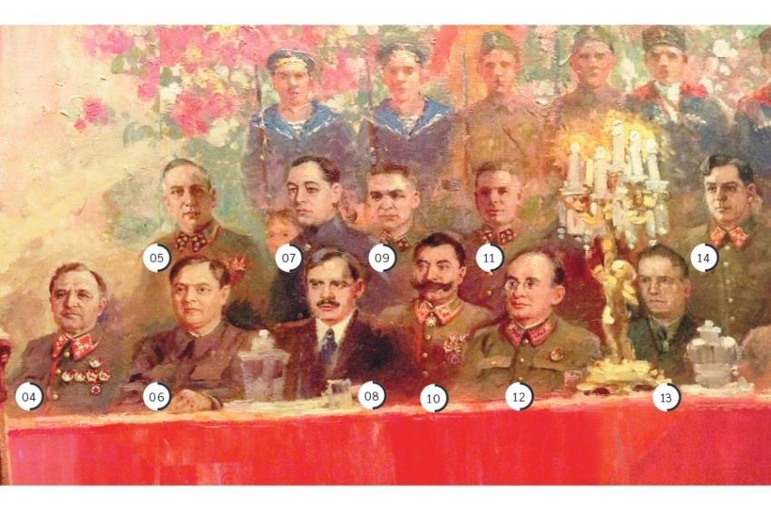 12. Лаврентий Павлович Берия (1899-1953). Генеральный комиссар государственной безопасности (1941), маршал Советского Союза (1945), Герой Социалистического Труда. Нарком внутренних дел. Изображен с петлицами комиссара государственной безопасности 1 ранга (при написании картины использована старая фотография).