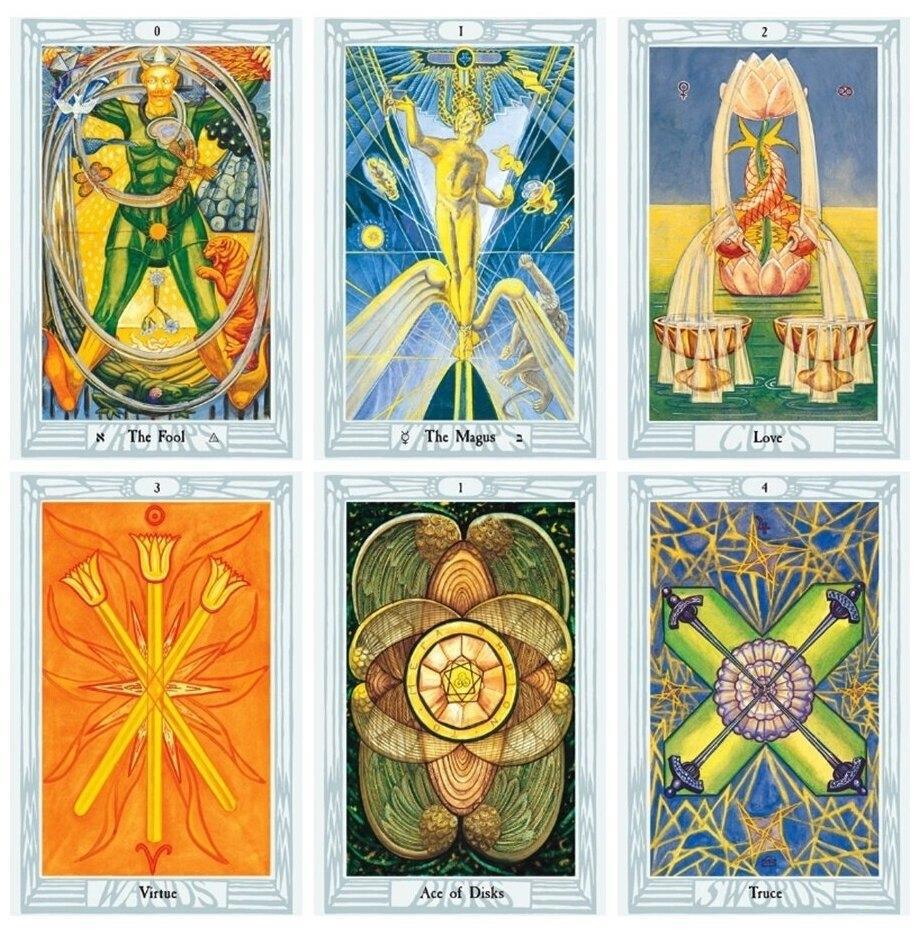 Алистер Кроули сам себя называл магом и пророком, которому суждено вести человечество в светлое будущее. Несмотря на то, что также работал с нежитью, о медиумах отзывался крайне отрицательно, мол, они пассивны, а вот он актив. Не, я не шучу. Это почти цитата. А ещё он нарисовал собственную колоду Таро, полную тайного символизма и в неожиданной стилистике. Возможно, он революционер в этом направлении и, на мой взгляд, больше ценен как художник.