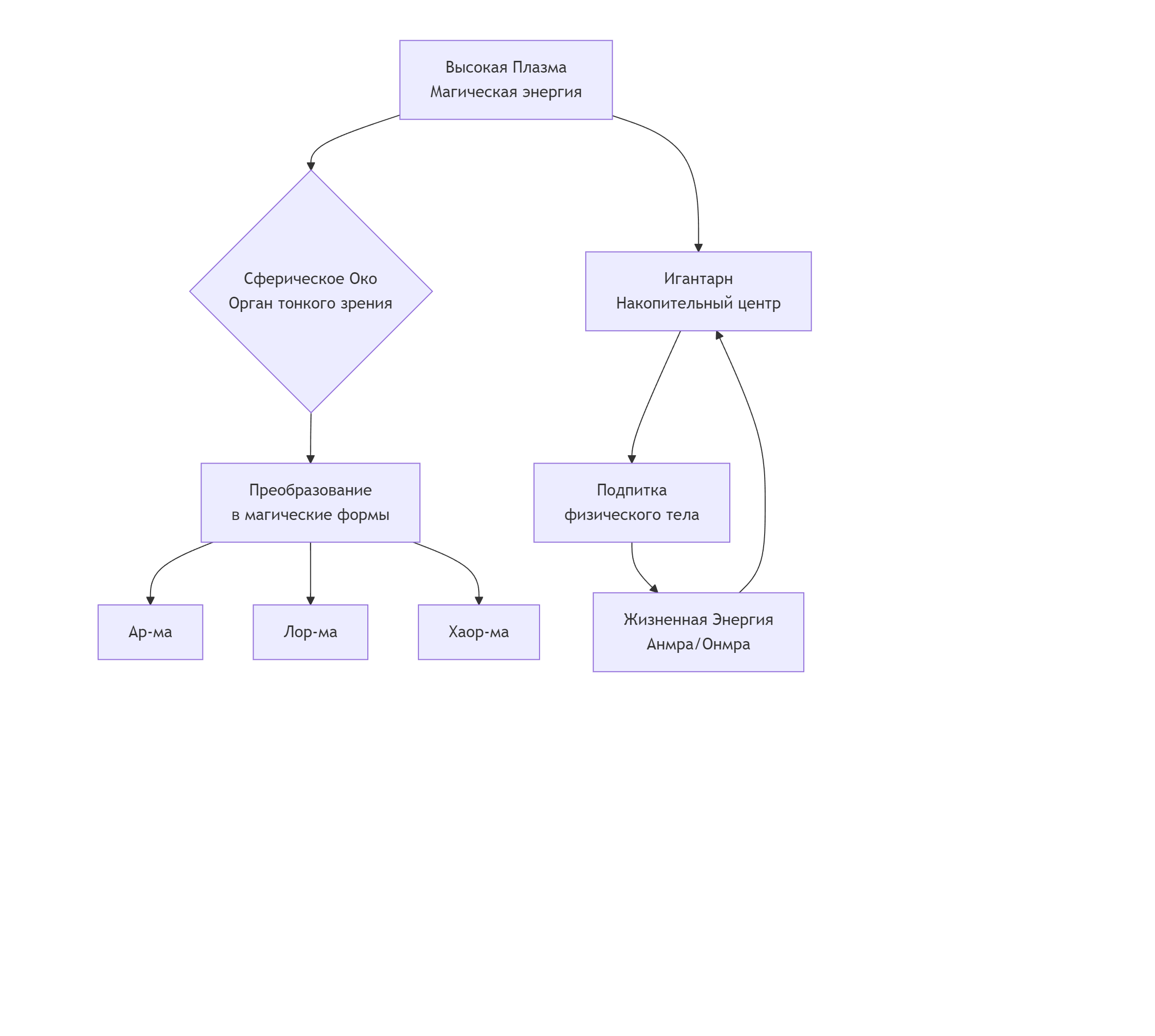 Пояснение: Высокая плазма накапливается в игантарне и расходуется на магию через Сферическое Око. Жизненная энергия вырабатывается телом и также накапливается в игантарне, отвечая за эмоции и желания.
