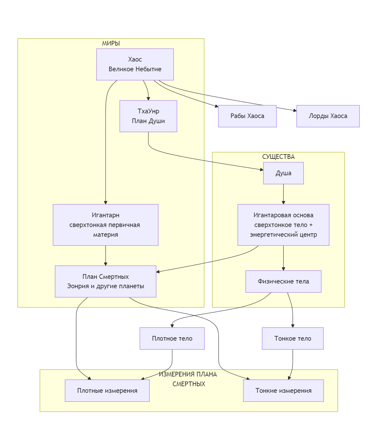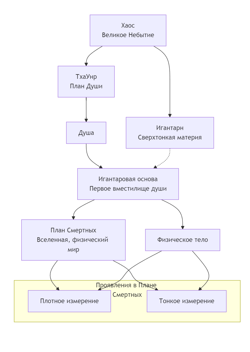Пояснение: Вся материя существует внутри Плана Смертных. Души находятся в ТхаУнре. Игантарн связывает душу с физическим телом в Плане Смертных, выступая основой для любого живого существа.