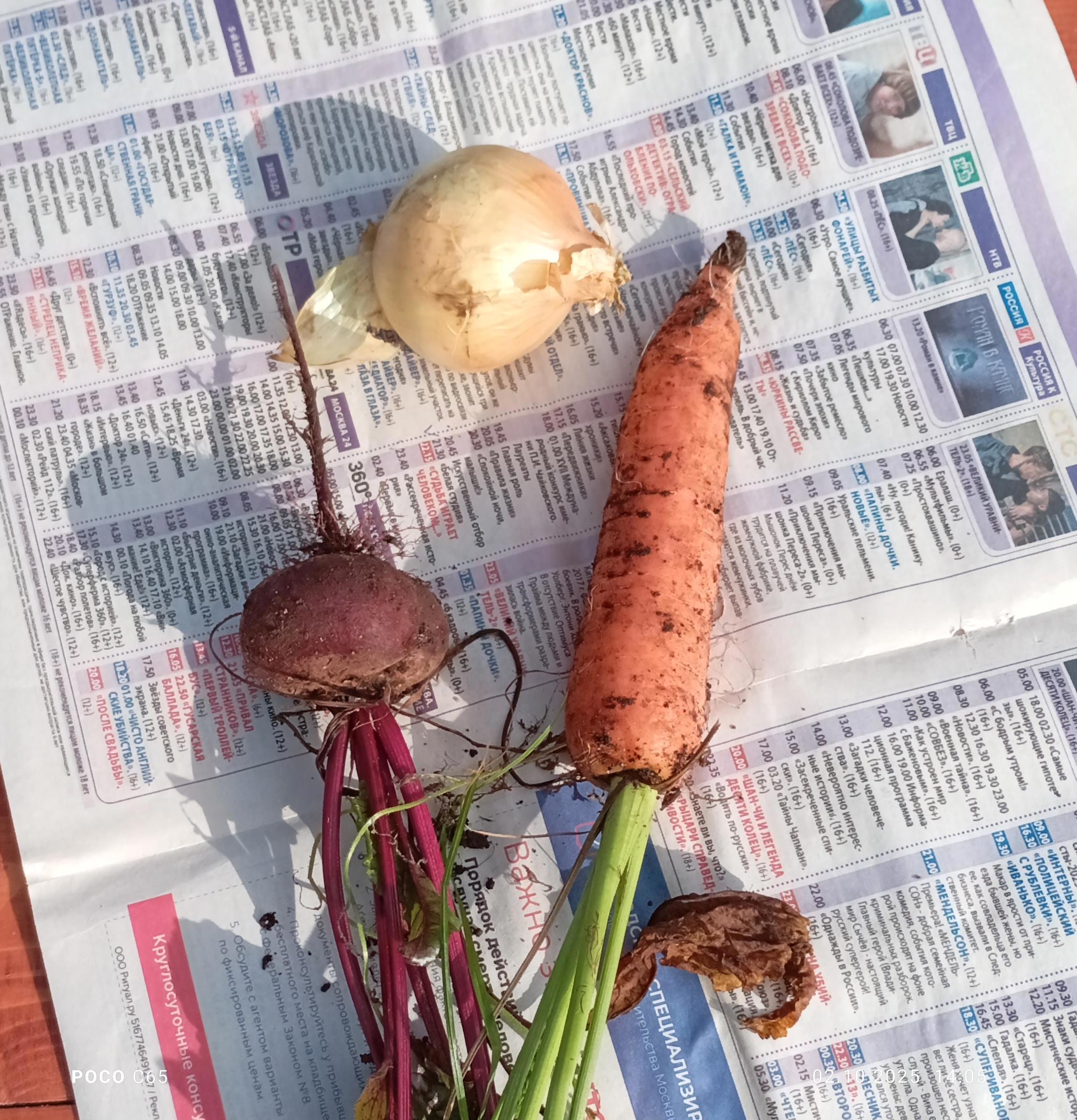 Как приехал на дачу, сразу поставил куриные бедра вариться. Пошел в огород дёрнул одну свеклу и одну морковку.