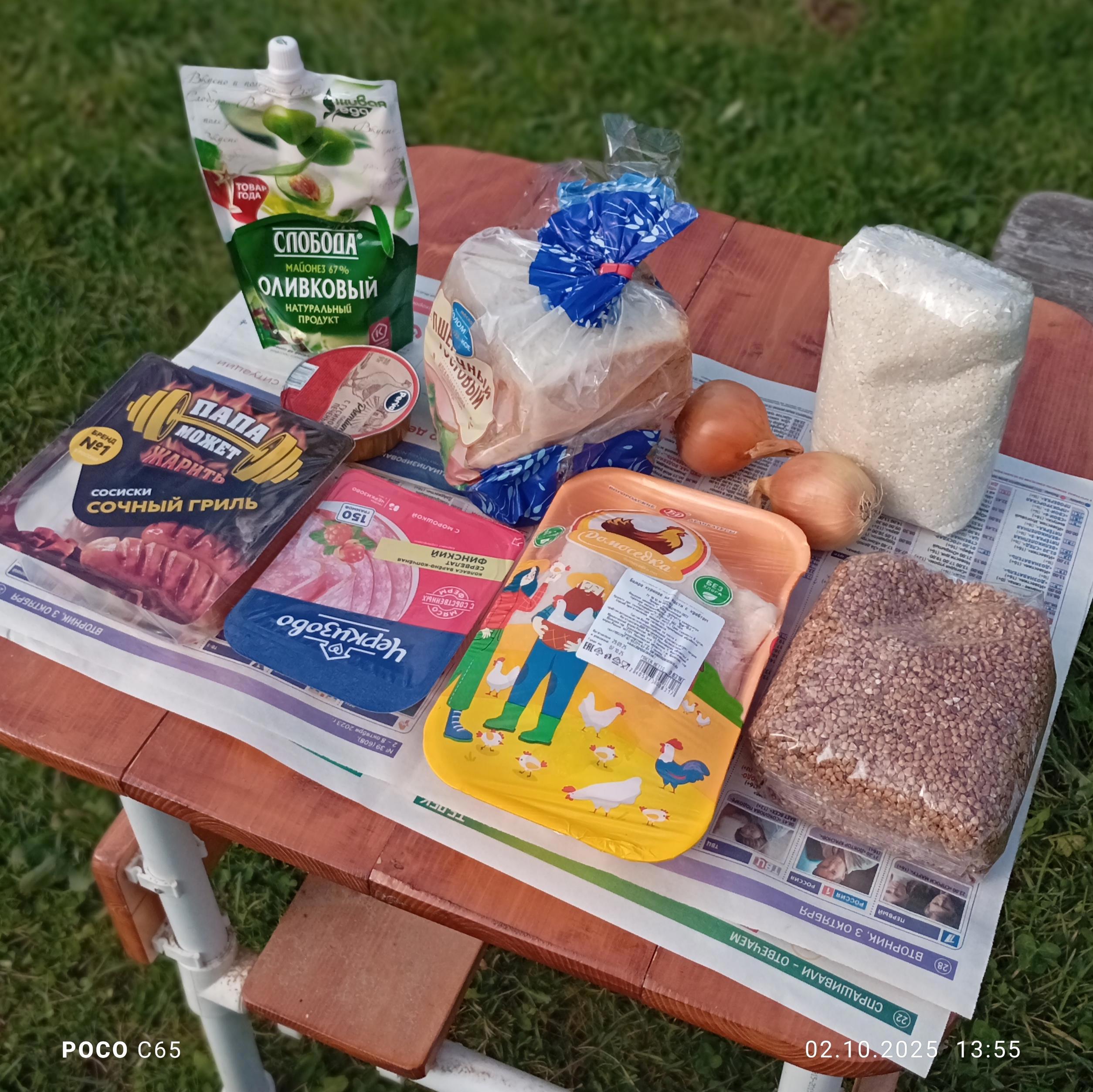 Пакет гречки 900 г-- 37 р, пакет риса - 37 р, 1,5 кг картошки - 37 р, яйца - 49 р, нарезка - 149 р, сосиски уп 9 шт - 139 р, куриные бедра 4 шт (800 г) - 300 р, батон хлеба - 54 р, паштет 95 г - 38 р, майонез - 109 р, чай высокогорный принцесса нури 25 пакетиков - 54 р