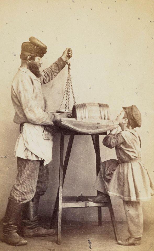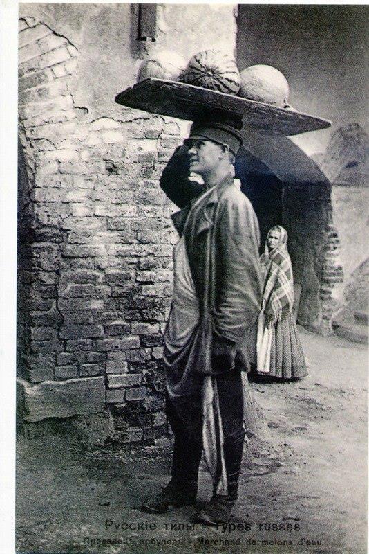 Обратите внимание на головной убор мужчины, на 99% уверен, что сверху пришита подушечка для переноса тяжестей на голове. На многих дореволюционных фотографиях люди несут на голове различные предметы, а на этом фото можно посмотреть, благодаря чему это делалось.