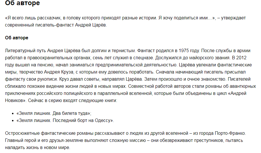 Автор: Андрей ЦаревНастало время ох уительных историй. Литрес опубликовал мою биографию. Начну с плохого. Я никогда не говорил этой херни, что у них в заголовке. Но предполагаю, где они ее взяли. Есть еще один писатель с таким же именем, вот у него взяли.