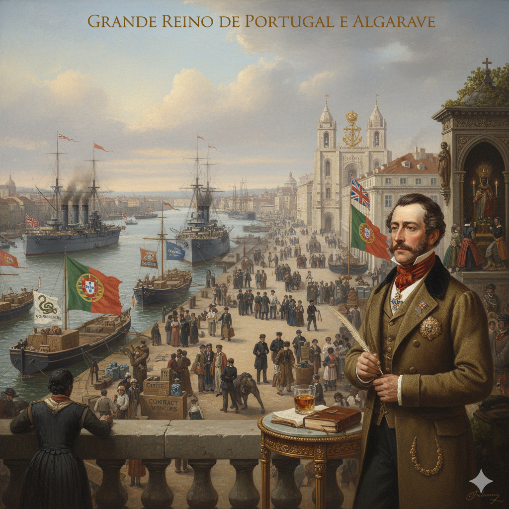 ·Государственное устройство: Конституционная монархия, чья конституция была «подарена» Лондоном. Находится в династической унии с Бразильской Империей, что создает сложную систему вассалитета. Реальная власть в Лиссабоне принадлежит не королю, а британскому послу и «советникам» из Адмиралтейства, которые контролируют внешнюю политику и оборону.