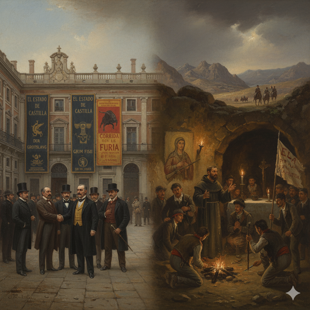 ·Народная вера: Душа Кастилии, гордая и несгибаемая, ушла в подполье. Подавляющее большинство крестьян, горожан и даже обедневших аристократов тайно остаются верны «истинному» Папе в Риме. Для них Папа — не марионетка, а мученик, плененный австрийскими еретиками, а император Триединой Империи — его защитник. Деревенские священники тайно поминают Папу на мессах, а в горах скрываются странствующие монахи-проповедники, призывающие к священной войне против англо-голландских «протестантских дьяволов». Этот подпольный католицизм, смешанный с культом народных святых вроде Святой Себастьяны Пороховой, стал идеологическим топливом для герильи ELA. Агенты Триединой Империи, под видом пилигримов, активно проникают в Кастилию, раздувая пламя этого религиозного пожара.