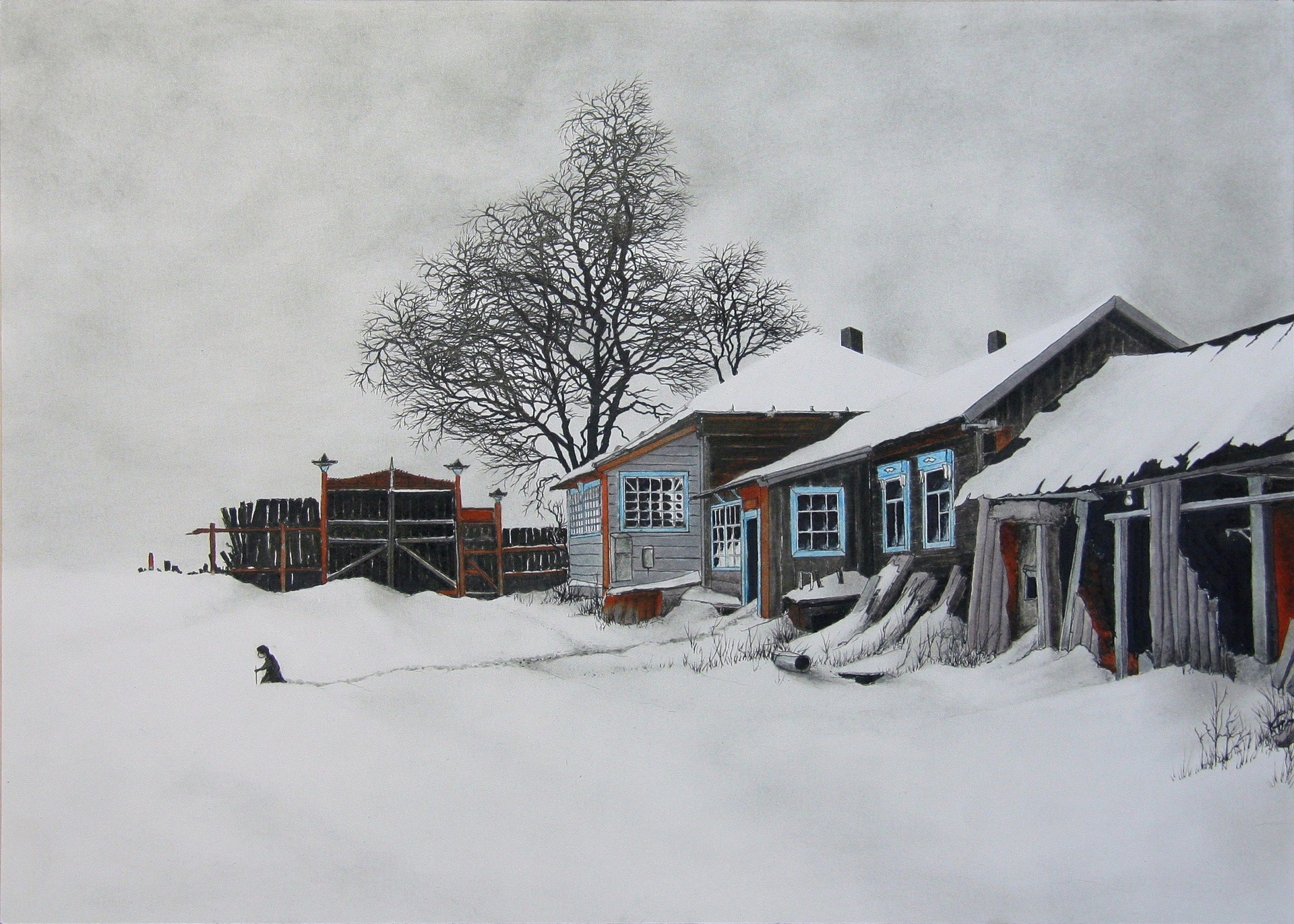 Картина лаконичная и очень выразительная. От этой маленькой чёрной фигурки на фоне белого снега, который сливается с огромным серым небом, сжимается сердце. И только потом замечаешь сломанный забор, выбитые стёкла, отпавшие доски и нетронутый снег вокруг. Заброшен дом, и никто больше сюда не приедет, не затопит печь, не поправит забор. Вот и остаётся домовому одно — пойти искать лучшей доли. И найдёт ли?..