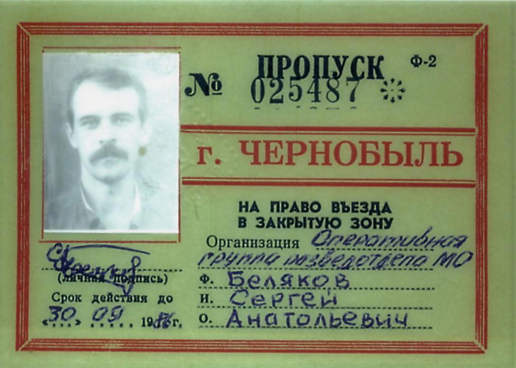 Вот мой пропуск в Чернобыль - он не был нужен для ходок на Станцию, туда мы ходили не "по паспорту", а по наличию пары рук, способных держать лопату, сбрасывая обломки нутра взорвавшегося реактора с крыши "тройки"... - это просто раритет, память о тех днях. На фото - я после тринадцатой ходки, после того, как потерял с десяток килограммов. Шея плавает в воротнике гимнастерки.