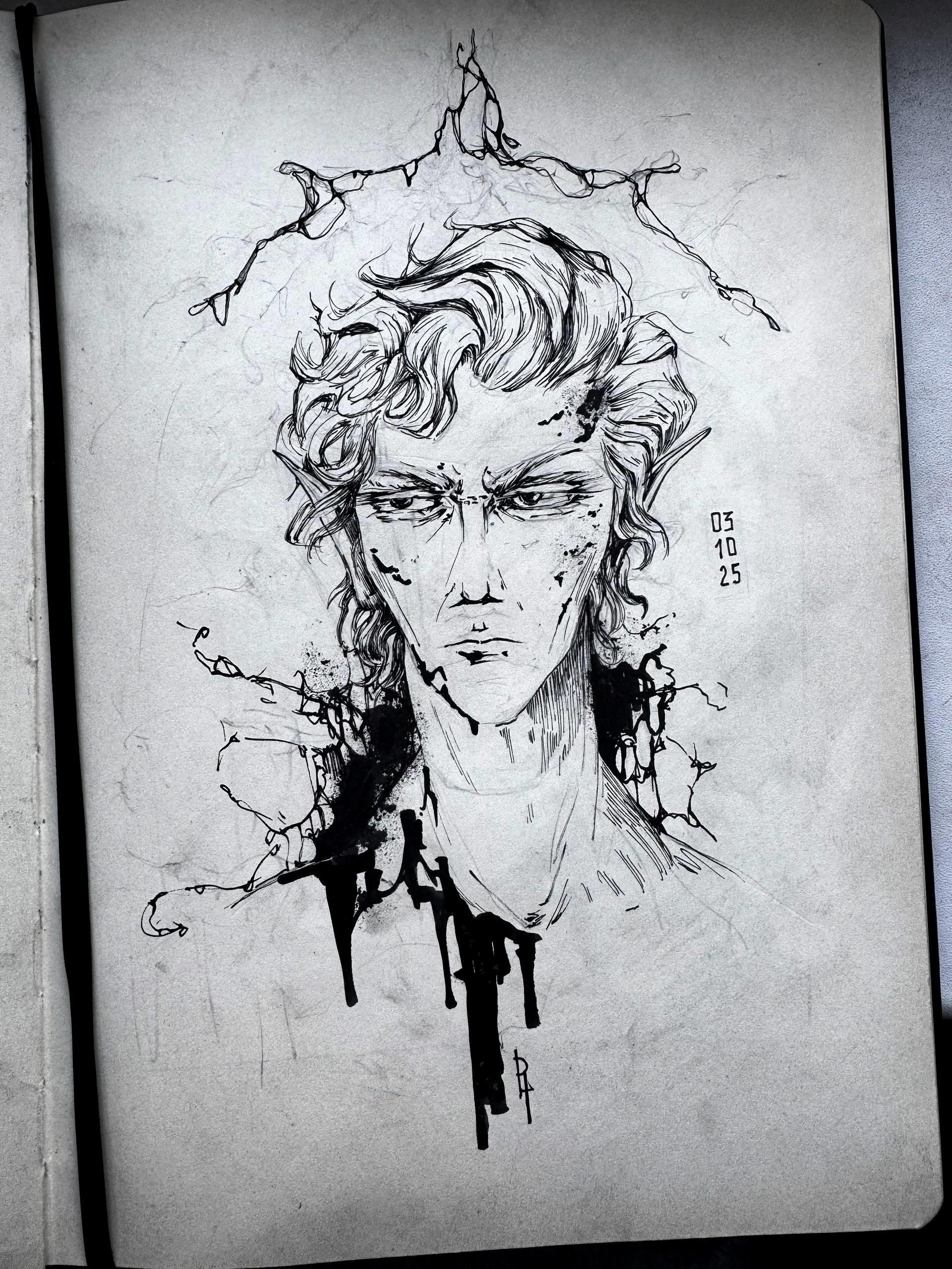 А ещё вот вам арт. Света в честь инктобера рисовала Астариона, а как по мне, получился вылитый Аллек (только ушей у него не должно быть и, пожалуй, морщин для 20-летнего чуууть-чуууть многовато), но вайб очень тот. В общем, вот так. Довольствуюсь тем, что есть