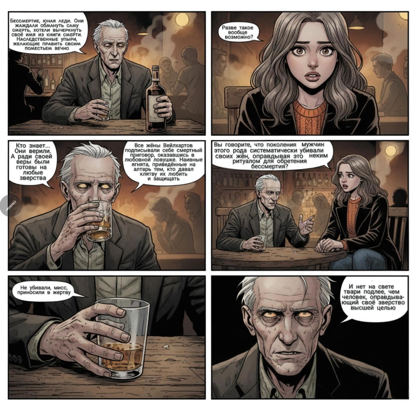 — Позвольте я уточню, — её голос прозвучал чётко, без тени мистического трепета. — Вы говорите, что поколения мужчин этого рода систематически убивали своих жён, оправдывая это неким ритуалом для обретения бессмертия?