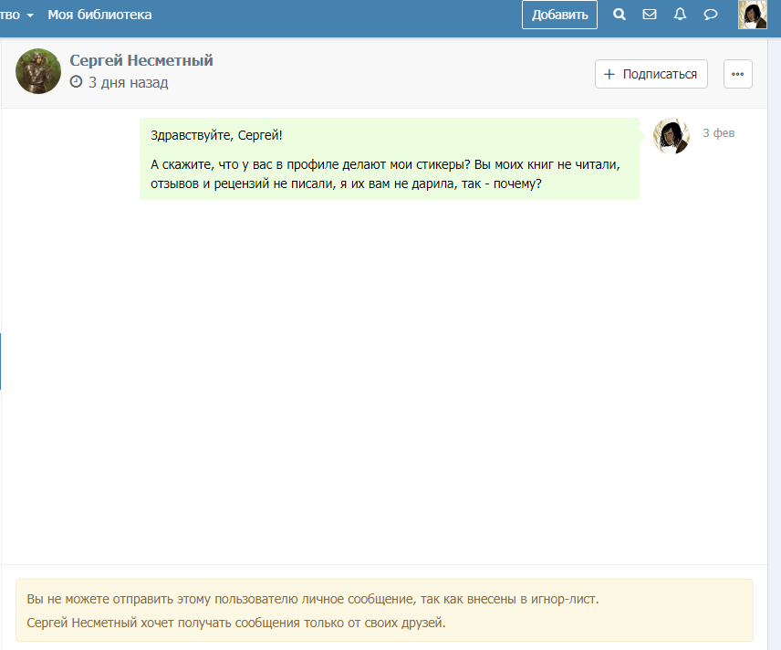 Так вот, этот товарищ в своём профиле предлагает написать любым желающим рецензии. ОК, почему бы и нет? Однако дальше, под этим предложением товарищ Несметный разместил мои стикеры.