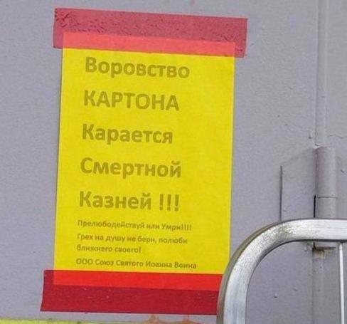 Рис.4. «Воровство КАРТОНА Карается Смертной Казней!!!» (с). Плакатик на двери магазина. Автор: Андрей Владимирович Рогачёв – основатель «Пятёрочки» и «Верного». Сей магнат – сектант, с напрочь отбитой в этом смысле головой.