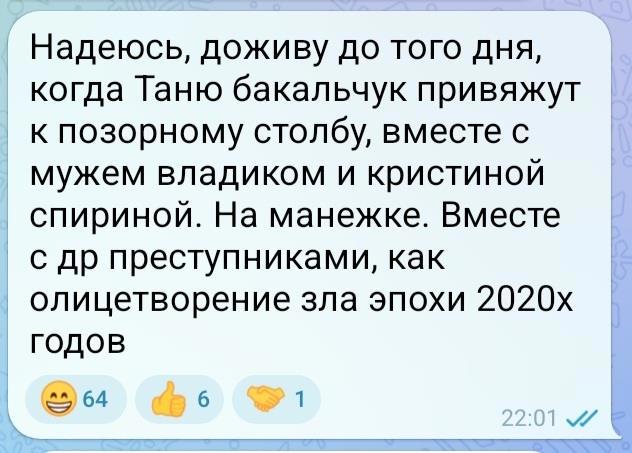 Рис. 12. «Надеюсь, доживу до того дня, когда Таню Бакальчук привяжут к позорному столбу… вместе с иными топ-менеджерами… на Манежке.Вместе с другими преступниками, как олицетворение зла эпохи 2020-х годов». 2023 год.
