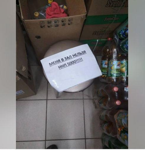 Рис. 8. «Меня в (торговый) зал нельзя. ННП (не начисление премии) 5000!!!!!» (с). Надпись на стул приделал Сергей Петрович Студенников – основатель «Красное и Белое». То есть: при работе в продажном помещении магазина Рабам запрещается сидеть на стуле. Сам стул – в подсобке.