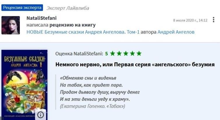 Из книги "Андрей Ангелов - Гений или Миф". По факту: эта рецензия только на безумно-сказочные рассказы автора, коих 13 штук. Повести и романы здесь не отражены прекрасной Натальей, видимо.