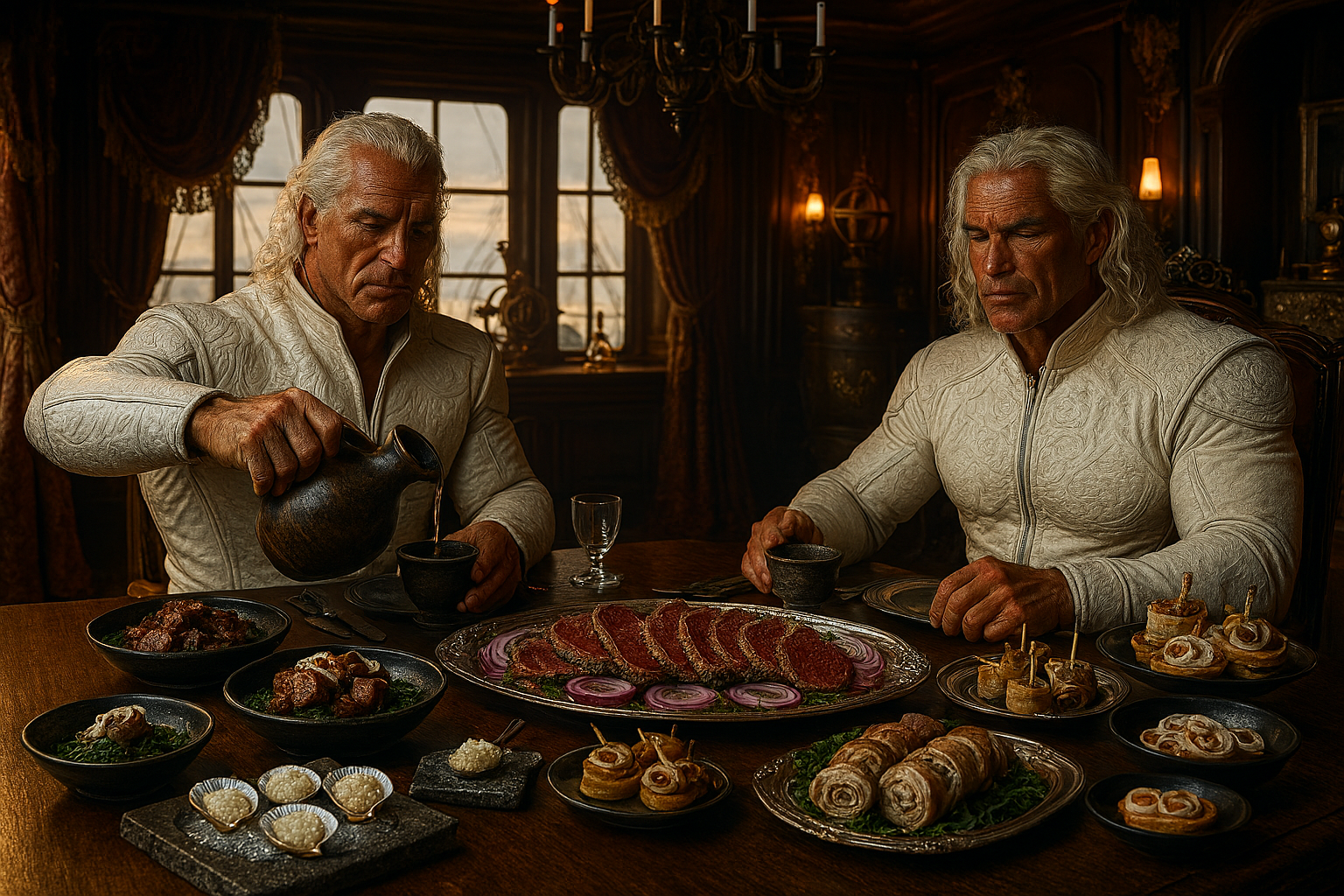 В центре — тонко нарезанные медальоны жареного мяса кита, поданные на серебряном блюде с ломтиками маринованного лука. Рядом — фаршированные китовые языки, аккуратно свернутые, зафиксированные шпажками и украшенные тонко нарезанным корнем сельдерея. Левее — чёрные тарелки с мясом полярной капибары, тушённым с луком. Мясо нарезано крупными кубиками и подано на отварной морской капусте. На холодной каменной плите — белая икра альбиноса клыкача, выложенная в ракушки, каждая на подушке из льда, с миниатюрной ложечкой из тёмного дерева. Ещё одно блюдо — рулет из печени клыкача, охлаждённый и нарезанный тонкими ломтями, уложенными в спираль, с тонкой каймой из маринованных водорослей. Между основными блюдами — небольшие подставки с тарталетками: одни — с тёплым салатом из обжаренного осьминога и картофеля, другие — с кремом из копчёной трески и кольцами лука.