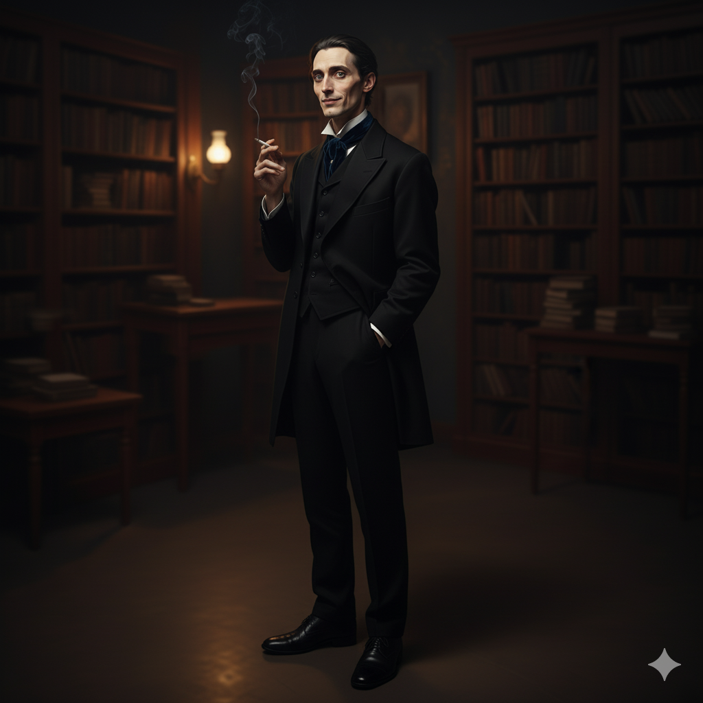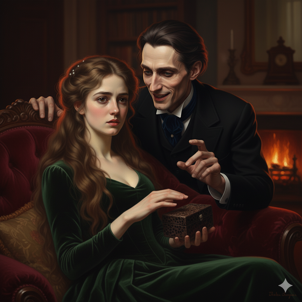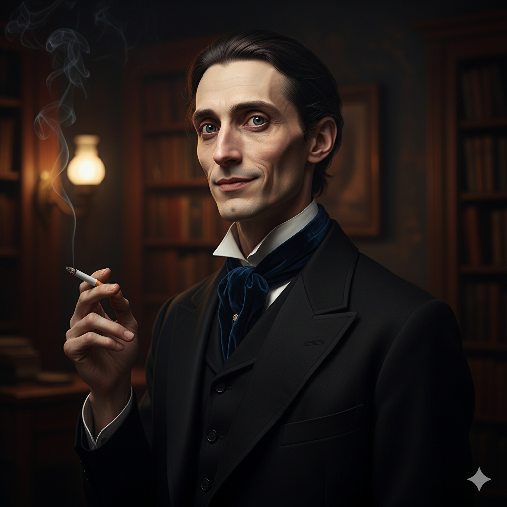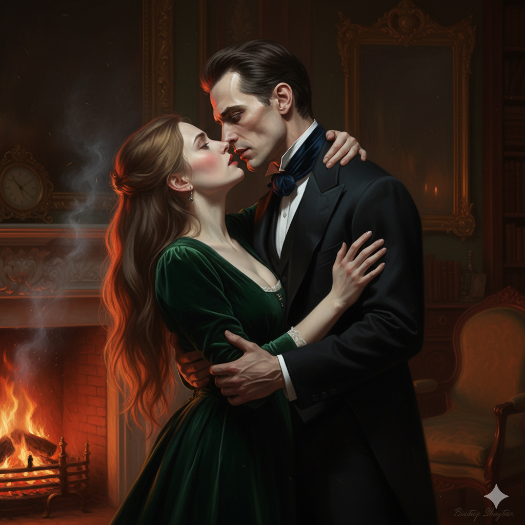Романтическое свидание у камина. Референсом для нейронки, очевидно, выступили обложки любовных романов - поэтому лицо поэта-декадента неузнаваемо изменилось, и он стал стереотипным героем-любовником. Поправлять я не стал, поскольку даже и этот уровень эротизма удалось выжать из гуглосетки с некоторым трудом... ))
