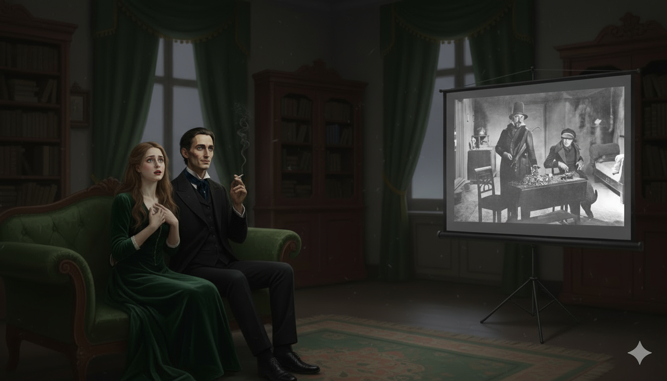 Домашний киносеанс и просмотр модной киноленты "Пражский студент", реальный кадр из которой и был использован. Взгляды героев обращены не на экран, как можно заметить. Будем считать это художественной условностью. Показать нормально и их лица, и экран одновременно в одной картинке мне не удалось.