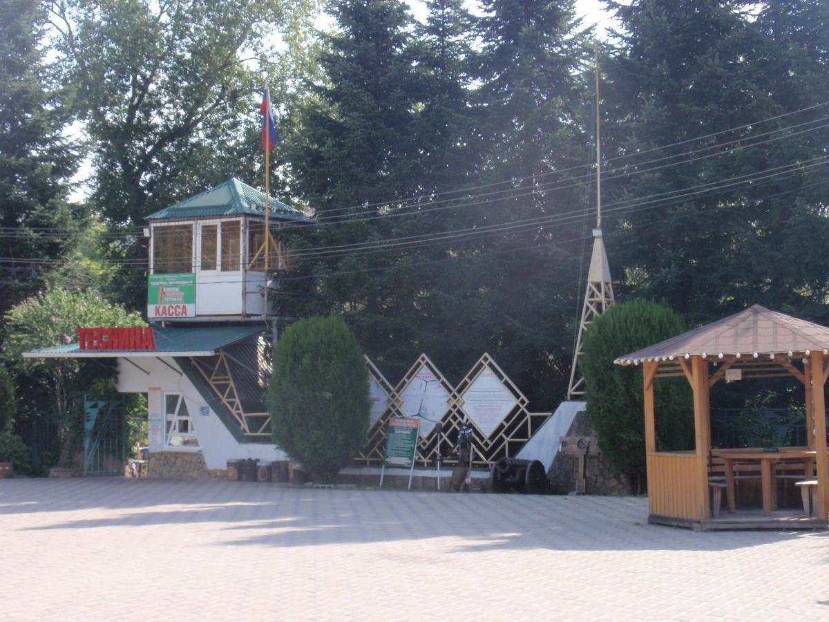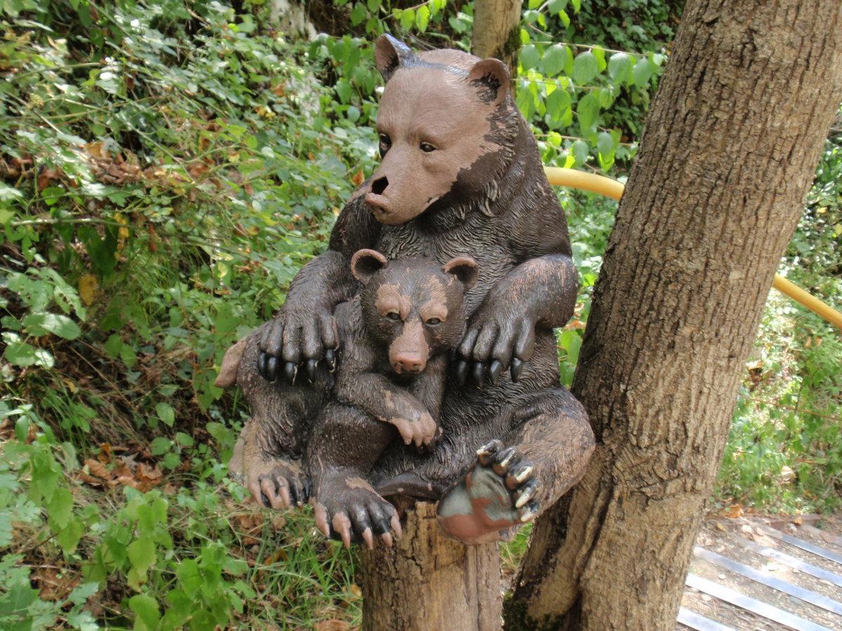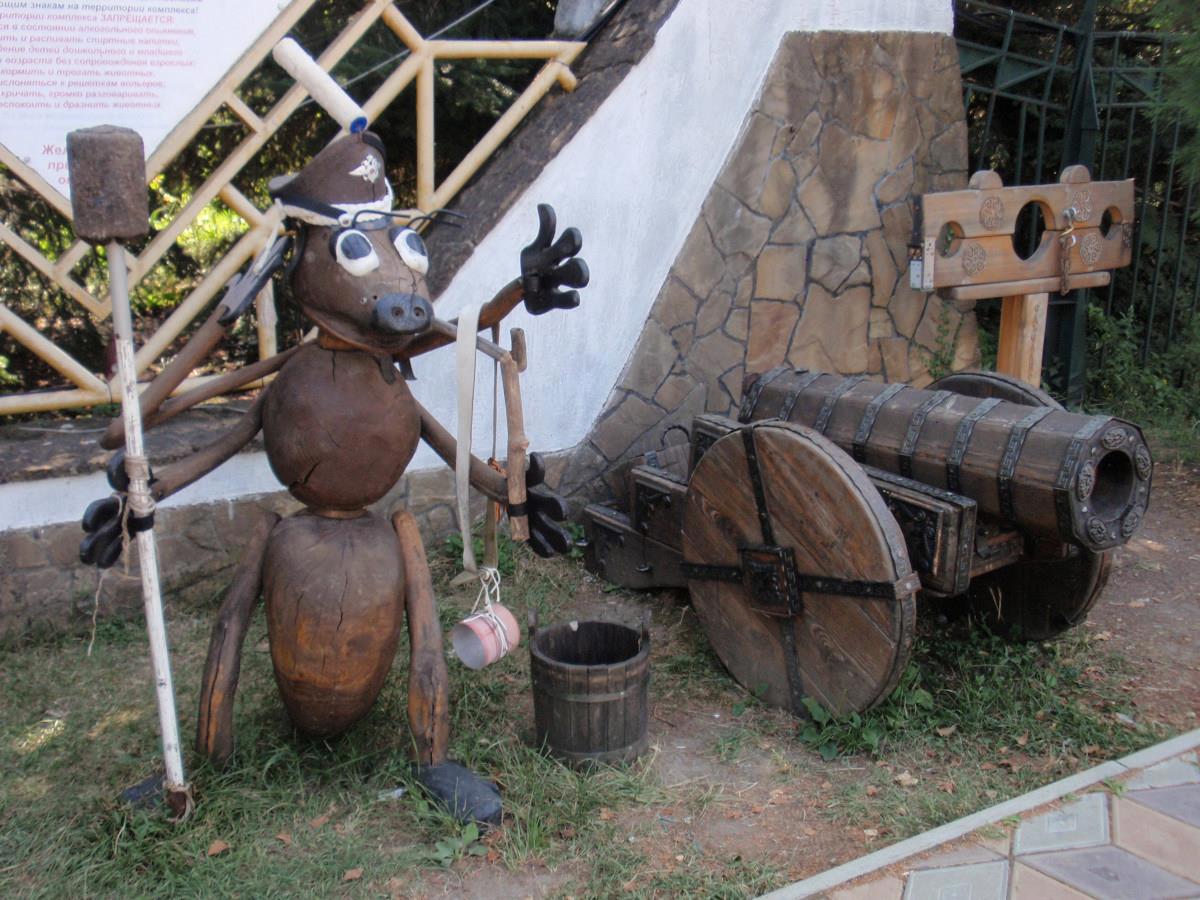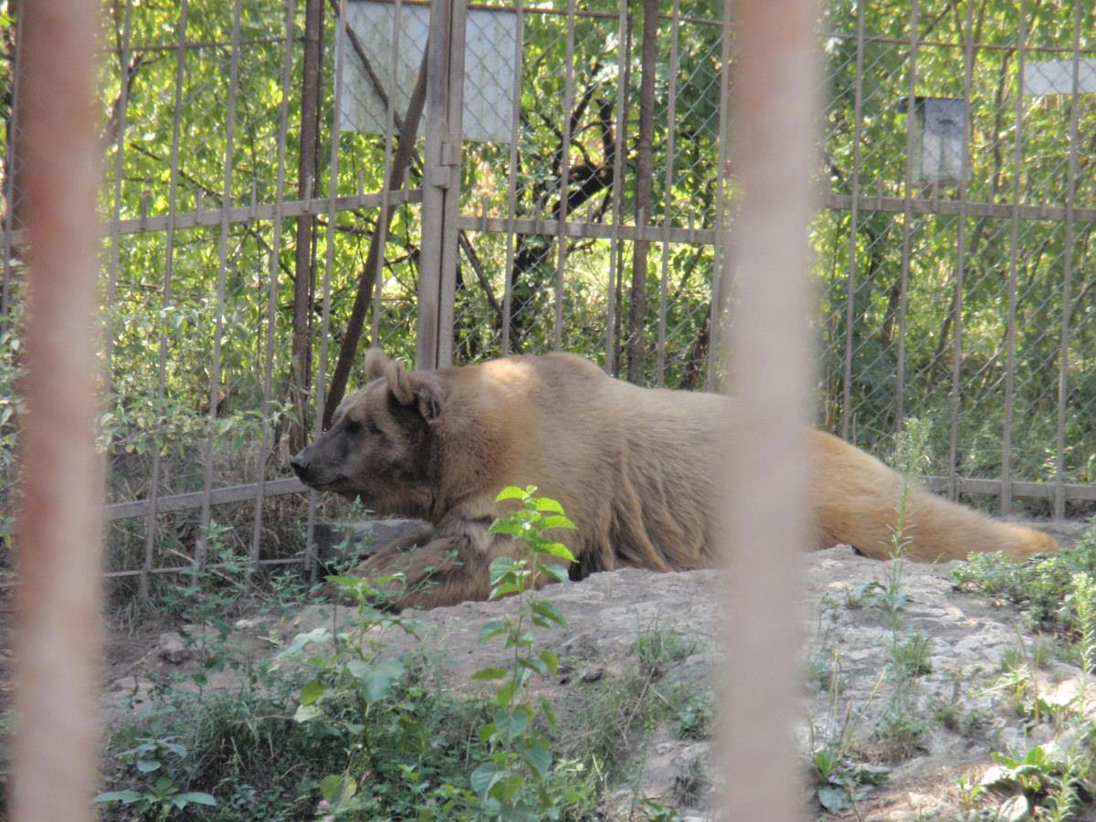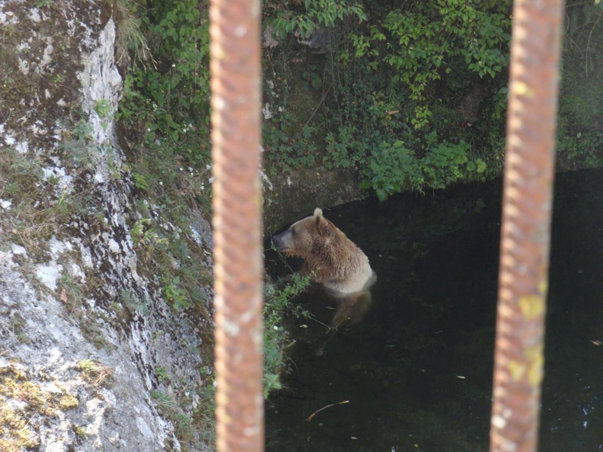 Рядом со входом в теснину устроена площадка, где торгуют сувенирами и яблочным соком в тетрапаках (Адыгея – край яблок, мы помним). Рядом – птичий двор с различными птицами от уток до павлина и мини-зоопарк с оленями, волками, лисами и медведями. Один из медведей в наш визит спал, другой (или другая) нежился в озерце. Жара была дикая, и мы ему отчаянно завидовали ))