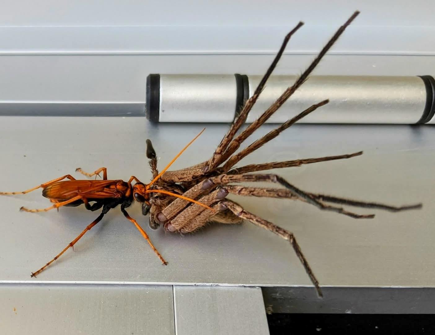 На фото оса-тарантуловый ястреб парализовала ядом гигантского паука-охотника и утаскивает его к себе в логово, чтобы отложить в него яйцо.