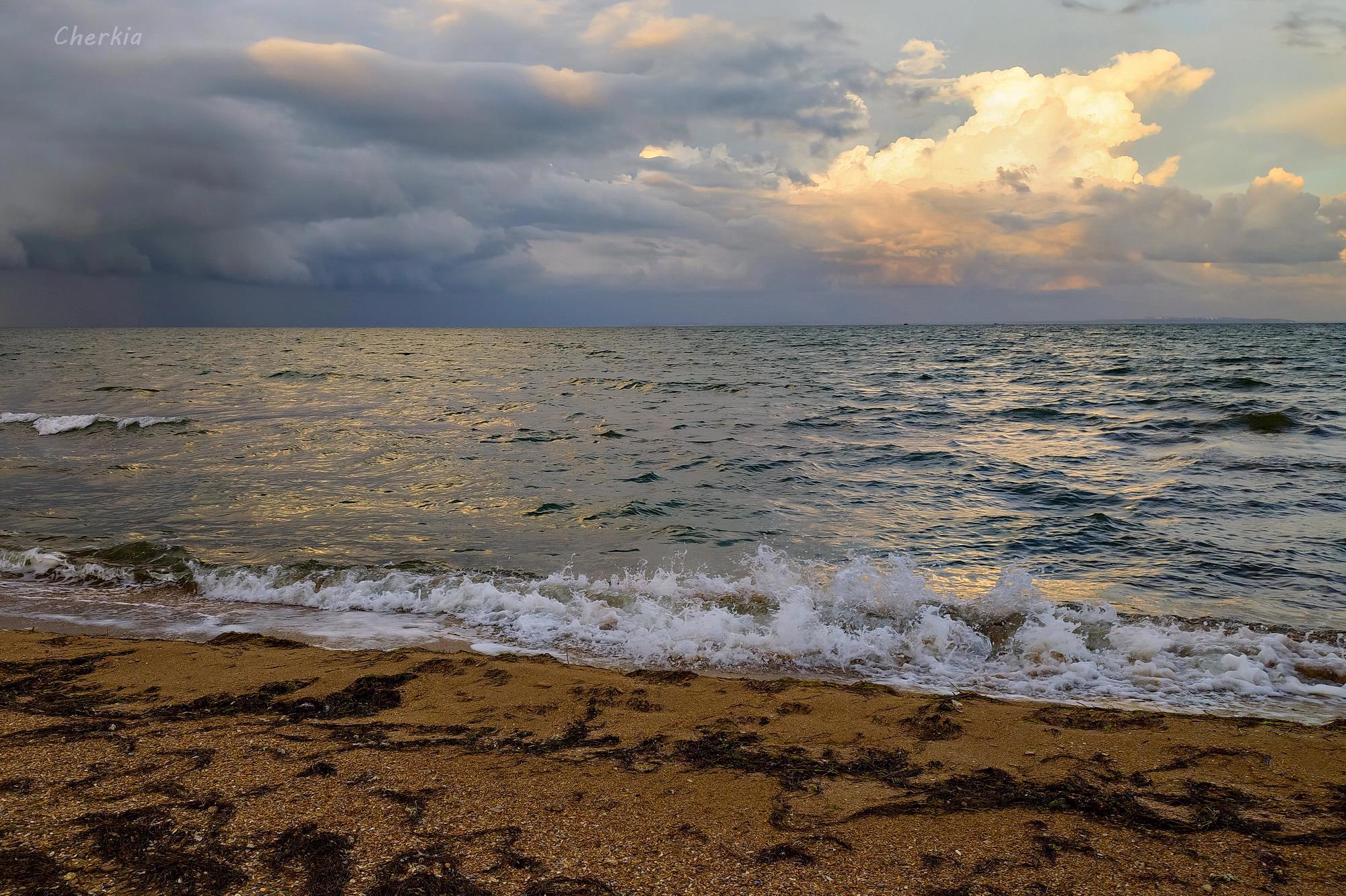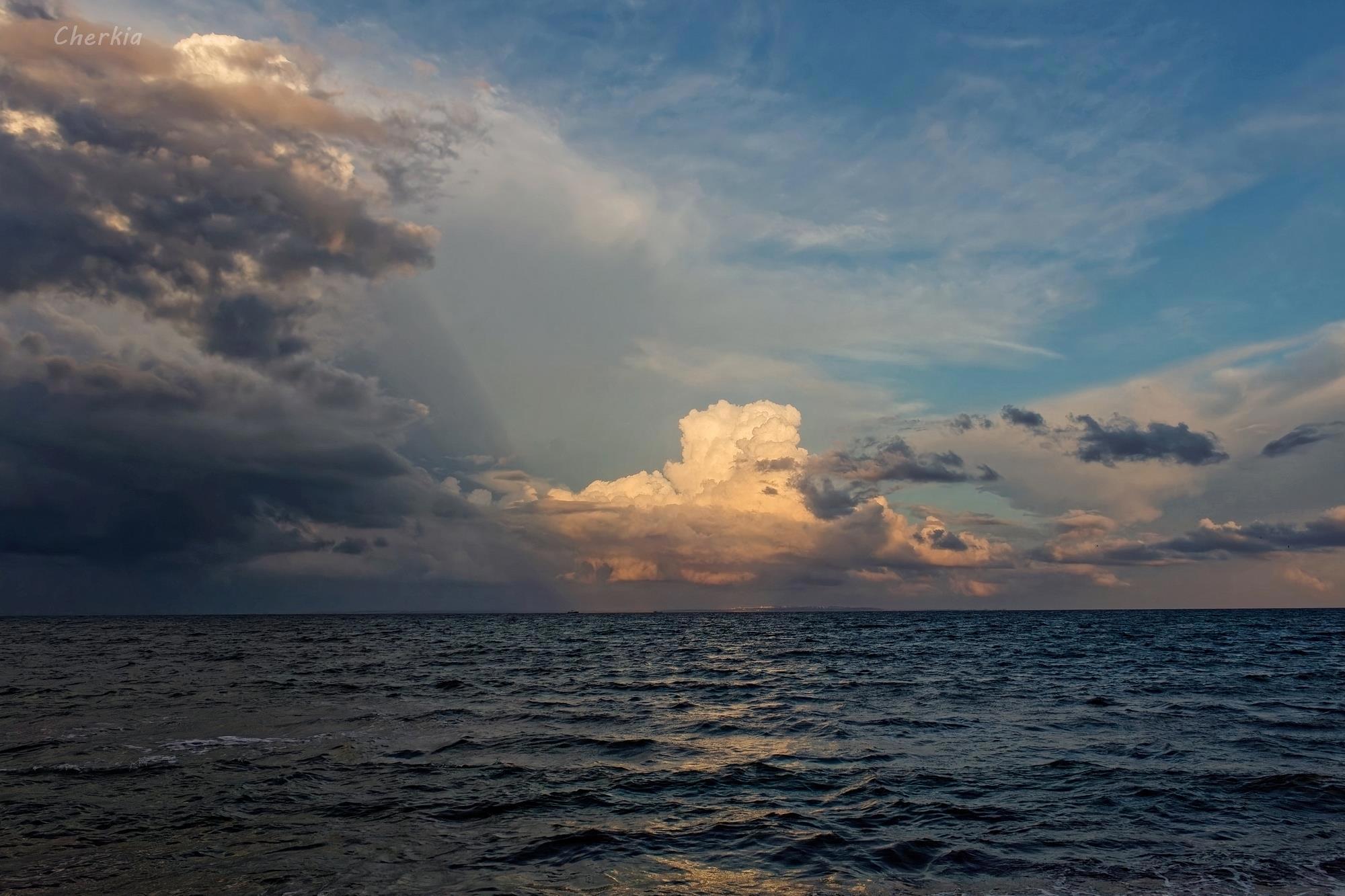 Огромная тучища слева тащила по морю дождь. А вода, когда солнце светило ярче, становилась невероятного оттенка, словно припылённая зелень, но при этом цвет сочный, глубокий. У художников наверняка есть для него точное название. Я вот очень люблю камень лабрадорит, у него цвет мрачнее, зелень штормовая и черные штрихи в толще камушков - словно вырванные волной водоросли. Вот в лабрадорите бывают и эти оттенки.