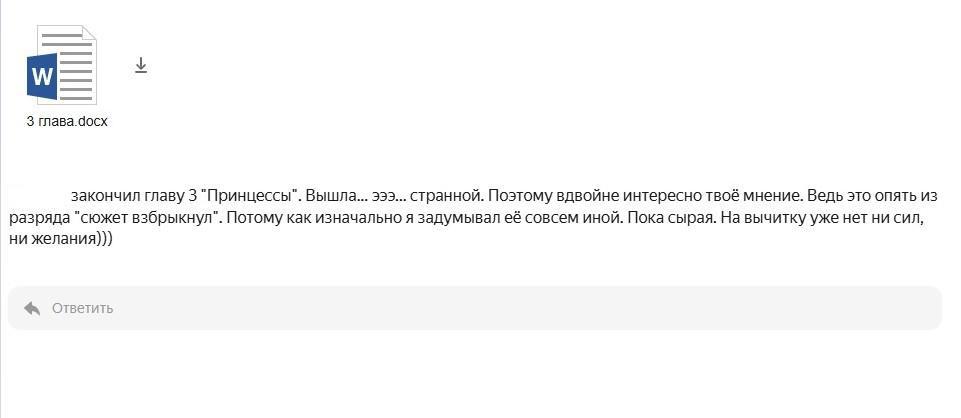 Поэтому быстренько скинул главу моему "научным языком" говоря бета-ридеру, критику и вдохновителю в одном лице. То есть - сестре. Сопроводил соответствующими пояснениями и отправился, наконец, спать. Примерно вот такое послание получилось.