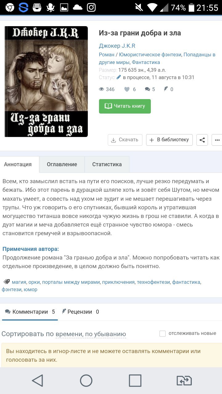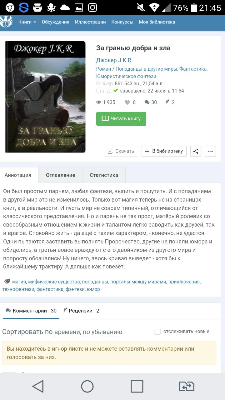 К чему я все это расписал. Не суди, да не судим будешь. На глаза мне не раз за сегодняшний день попадались комментарии недовольных людей из-за серии его блогов посвящённых конкурсу. Вот понимаете, он говорит В ТОПКУ по обложке чужих людей, а свои забыл привести в порядок. Качество картинок ужасное, они даже не соответствуют описанию аннотации. Это я его словами говорю.