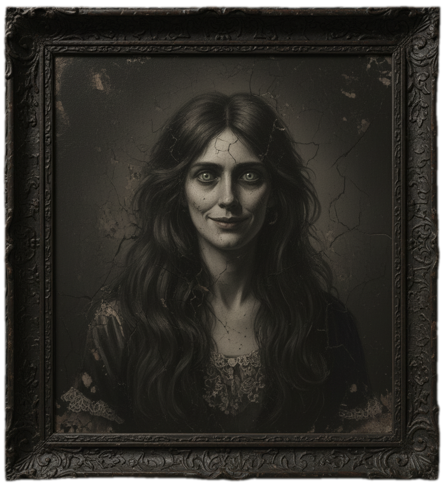 Автор: Надежда БрянцеваЭто был потрескавшийся, ветхий, потемневший от времени портрет без подписи, в тяжелой раме, на котором изображена женщина с темными длинными, слегка растрепанными волосами. Её тонкие черты лица, бледный лоб и ясные, пронзительные глаза создавали впечатление, что художник уловил мгновение лёгкого безумия. На её губах застыла странная, слегка пугающая улыбка, которая не предвещала ничего хорошего. Казалось, она жива и сейчас наблюдает за каждым движением гостьи, поселившейся в этой спальне.