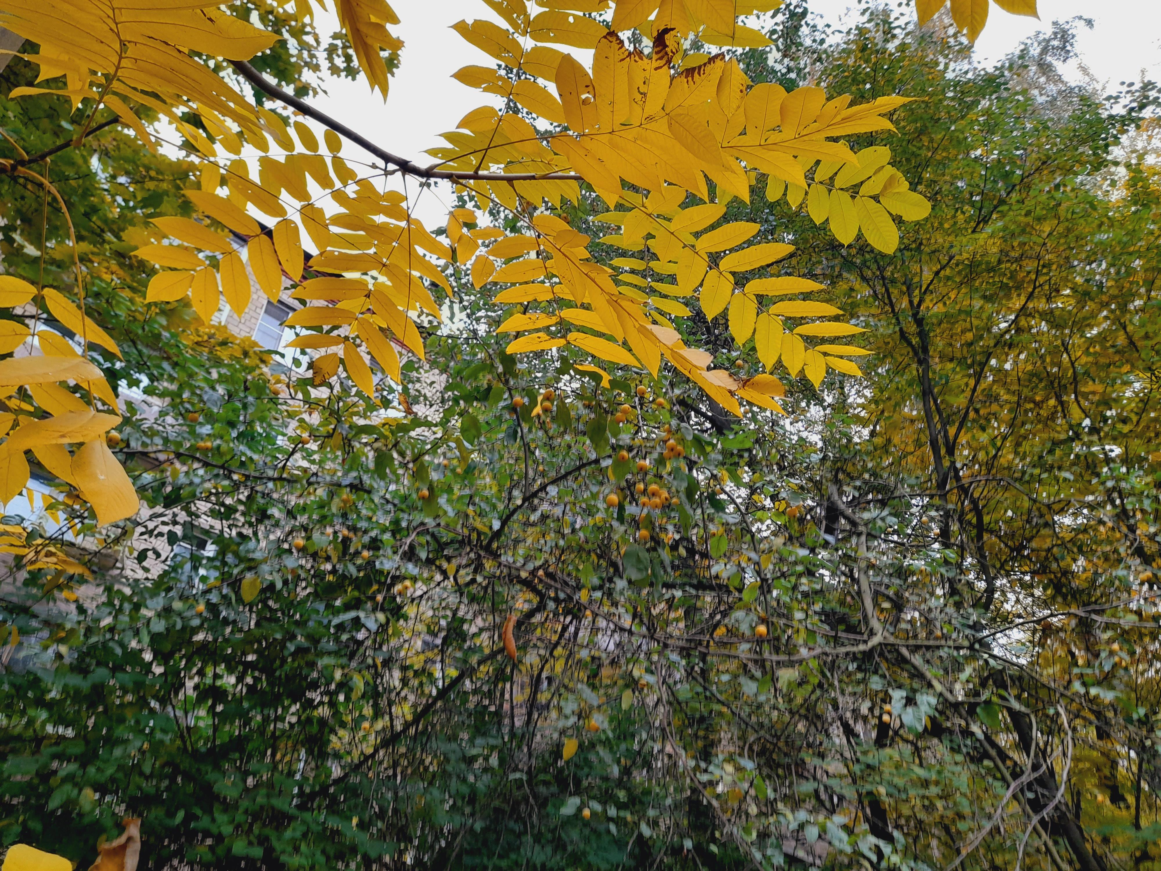 Орех маньчжурский и райское дерево с поспевшими яблочками у наших окон: