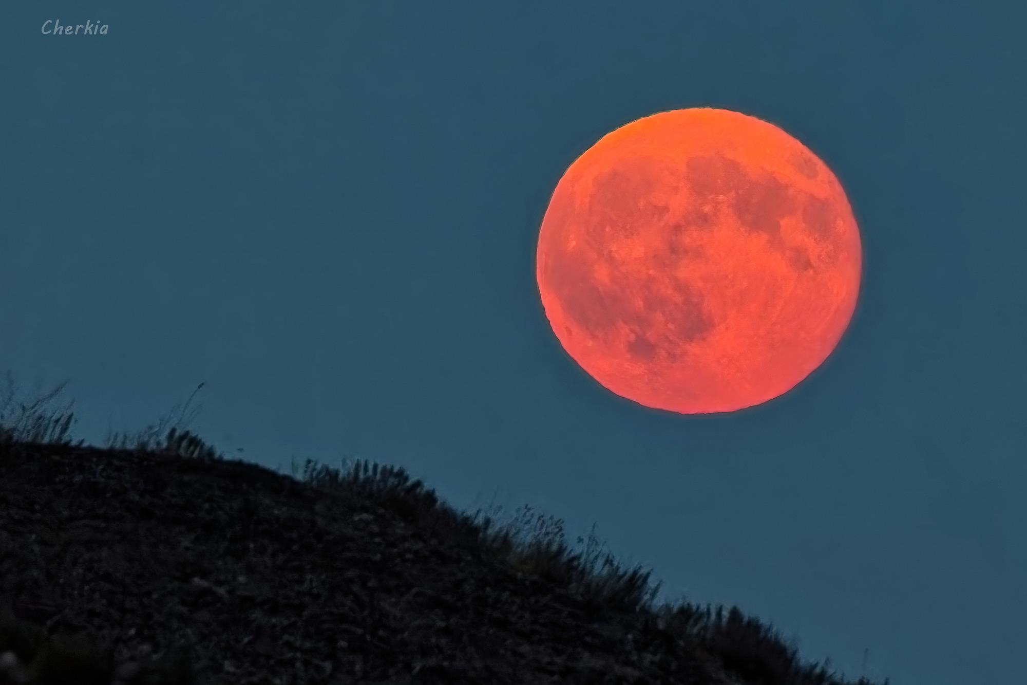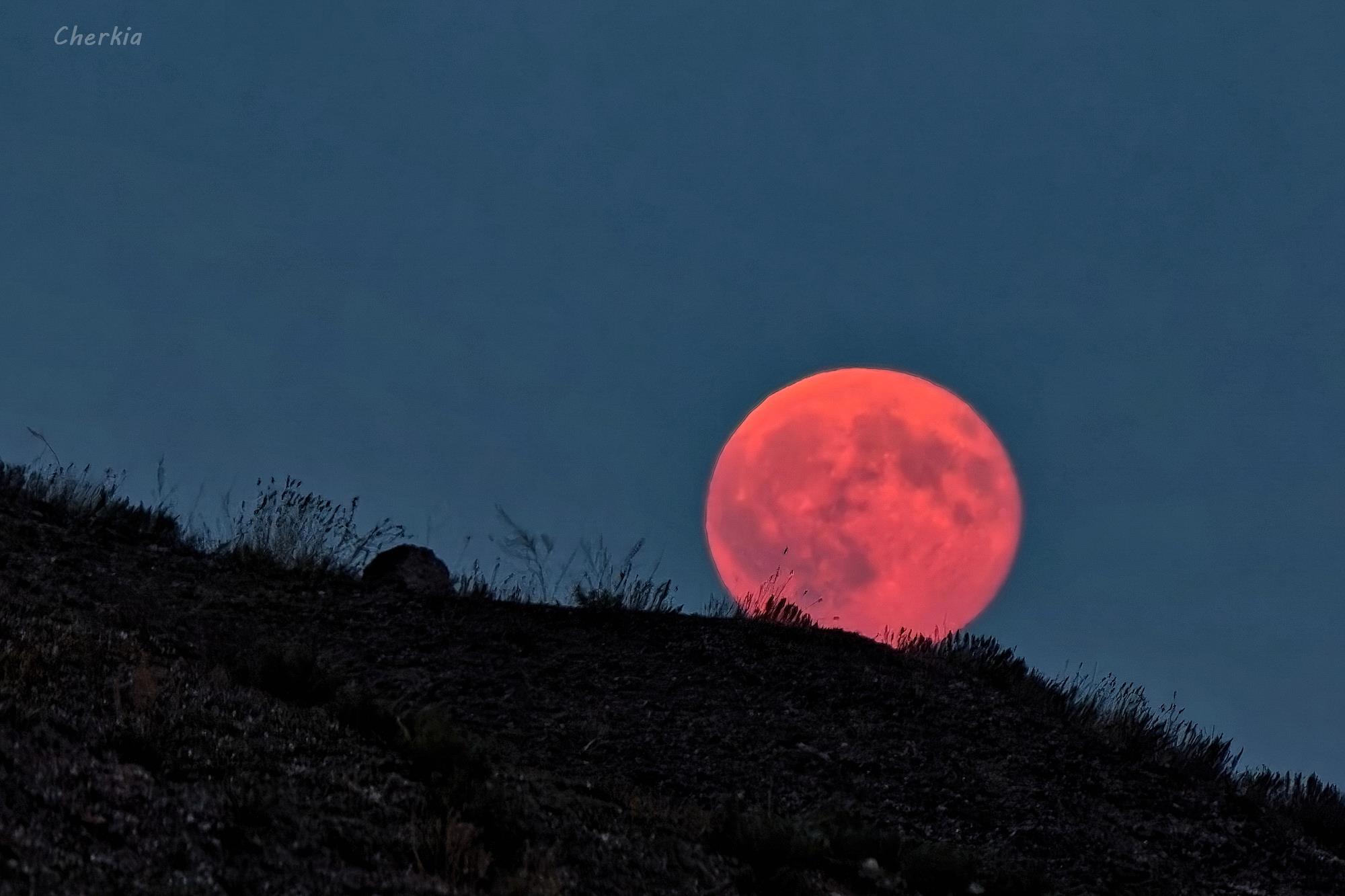 Автор: Елена ЧеркиаА вчера после заката раздавали луну. Огромную и красную, как поспевающий гранат. Уходя в небо, луна светлела, становилась ярче, но наплывали облака и ее затянуло невнятной дымкой. Поэтому снять, как я обычно делаю - с частичным экспозамером и минимальным исо, чтобы потом была картинка-карта, с кратерами и морями, не вышло. Но парочка портретов красной луны остались на память.
