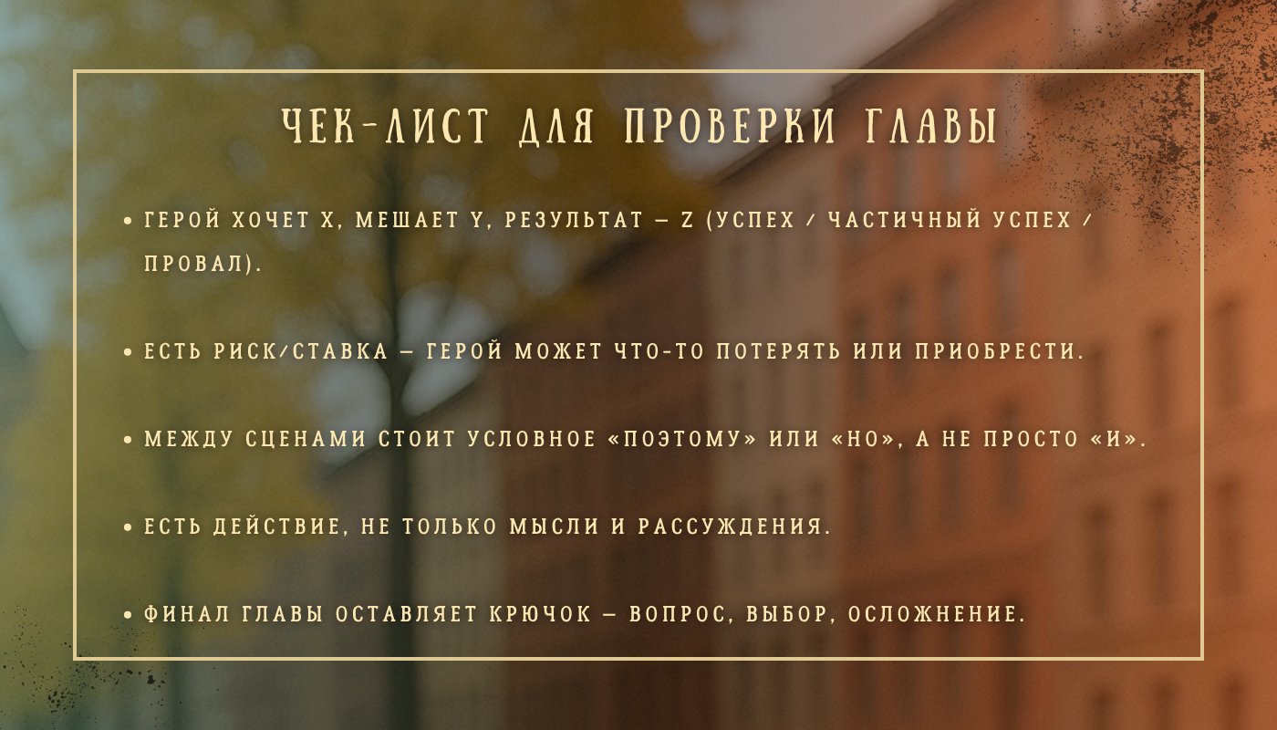 Что герой хочет? Что мешает? Чем заканчивается попытка? Каждая глава и сцена должны работать на то, чтобы приближать его к цели.