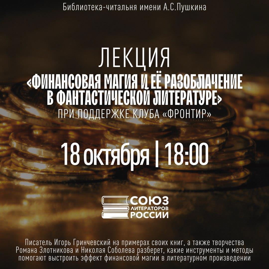 Автор: Игорь ГринчевскийНа следующей неделе, в субботу 18 октября в 18:00 состоится моя лекция в Пушкинской библиотеке (г. Москва) на тему «Финансовая магия и её полное разоблачение…» (полное название можно посмотреть по ссылке, оно длиннее).