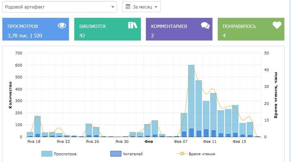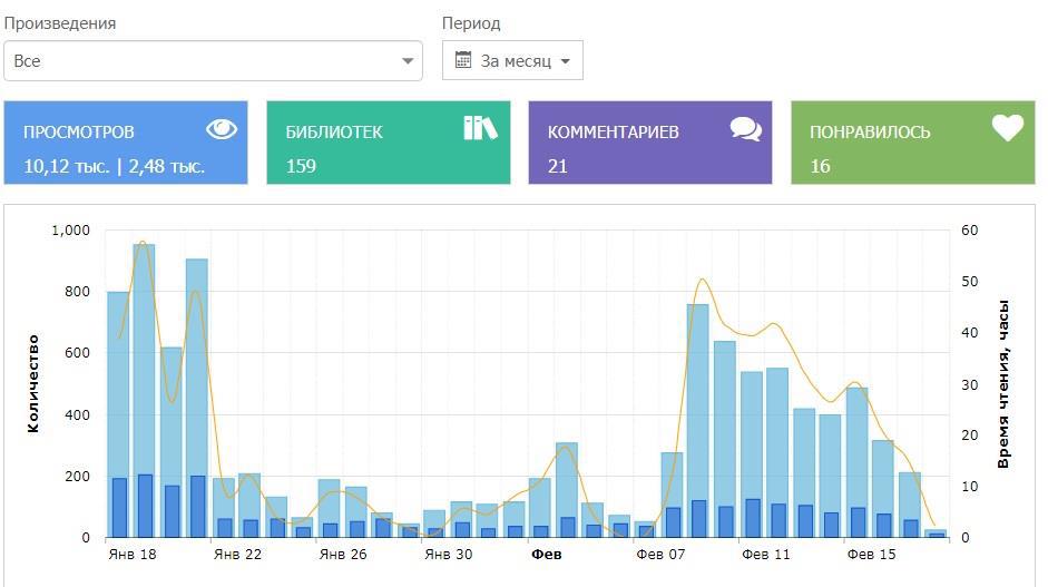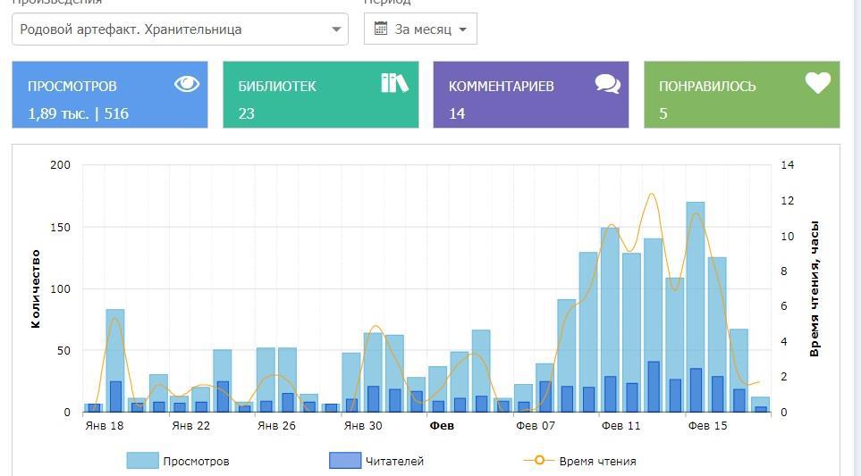 В начале года я поставила себе цель начать осваивать продвижение своих книг. В прошлом году я первый раз опробовала рекламу. Об моём опыте с "Непыльной полкой" Талани я уже писала. Результат за 300 руб. меня впечатлил.  Поэтому в январе я повторила такую точечную рекламу одной книги на 4 дня. Цена у Талани выросла на 100 руб., но всё ещё мне по карману. В январе с самых первых дней и до заказа рекламы у меня был рост просмотров и чтения. Праздничные дни располагали к чтению. После размещения Талани повторно рекламы "Бабочки-оборотня" она вновь показала просто скачок библиотек, просмотров, времени чтения. На "средний" по мнению Дмитрия Вишневского результат в 1000 библиотек за неделю я конечно не вышла, но для меня и удвоение библиотек у "Бабочки"-1 с 68 до 125 за 4 дня это тоже очень неплохо.  Кроме того выросло чтение и других моих книг.
