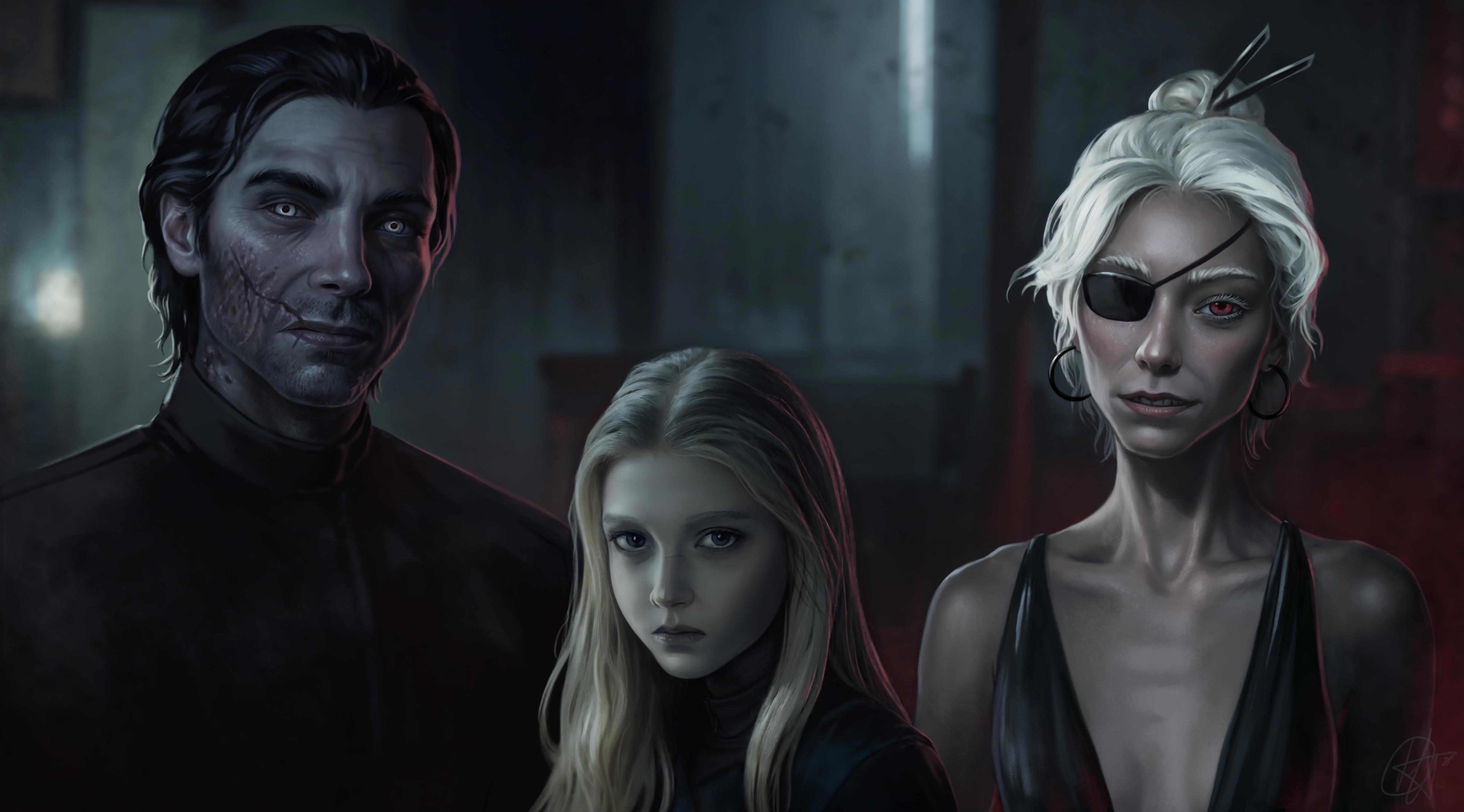 Работа рисовалась за кучу подходов на протяжении нескольких месяцев. Рисовалась в фотошопе, под конец некоторые текстуры подтягивались с помощью ИИ.