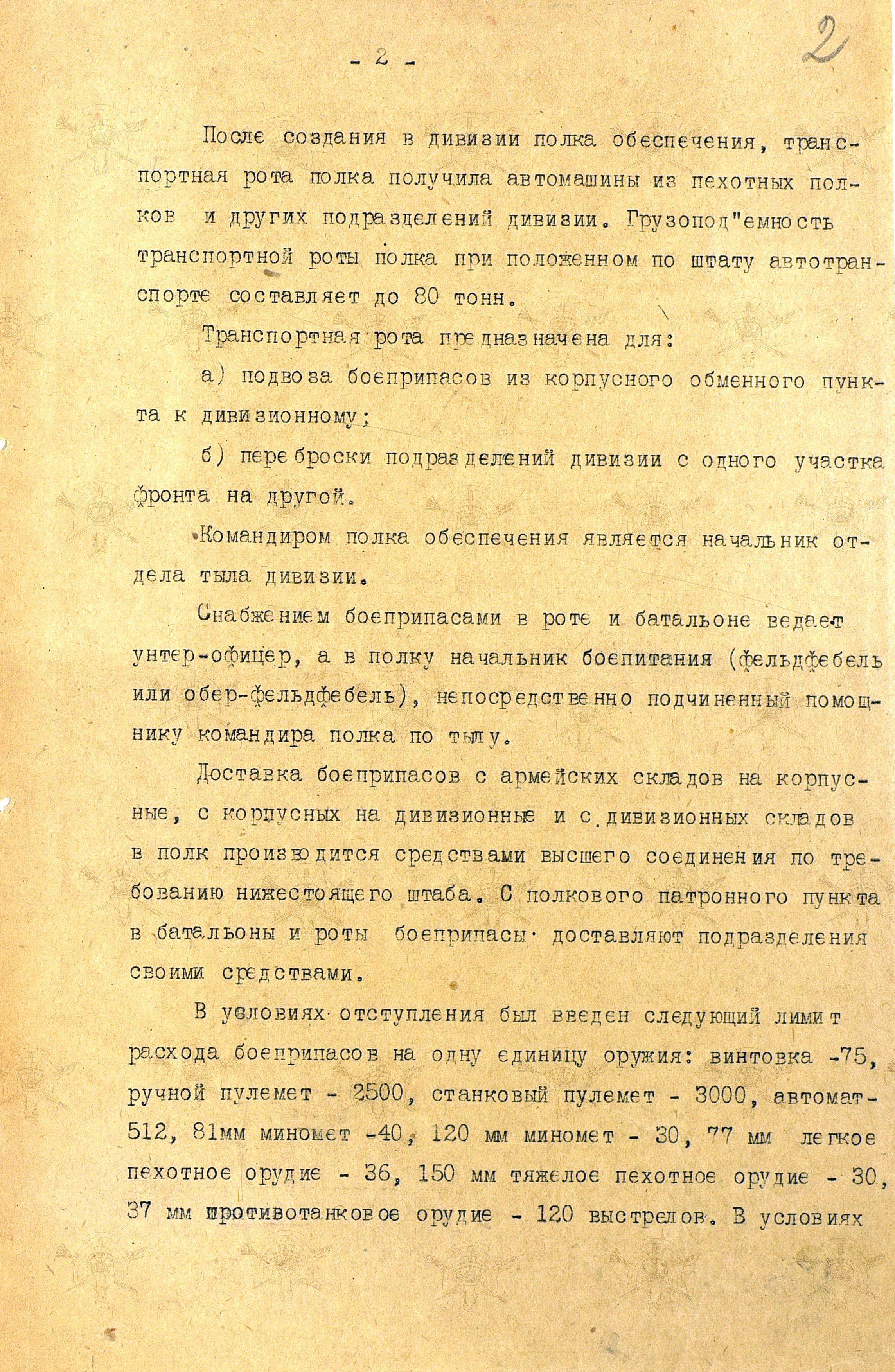 «В условиях отступления был введен следующий лимит расхода боеприпасов на одну единицу оружия: винтовка -75, ручной пулемет – 2.500, станковый пулемет - 3.000, автомат- 512, 81-мм миномет -40, 120-мм миномет - 30, 77-мм легкое пехотное орудие - 36, 150-мм тяжелое пехотное орудие - 30, 37-мм противотанковое орудие - 120 выстрелов.».