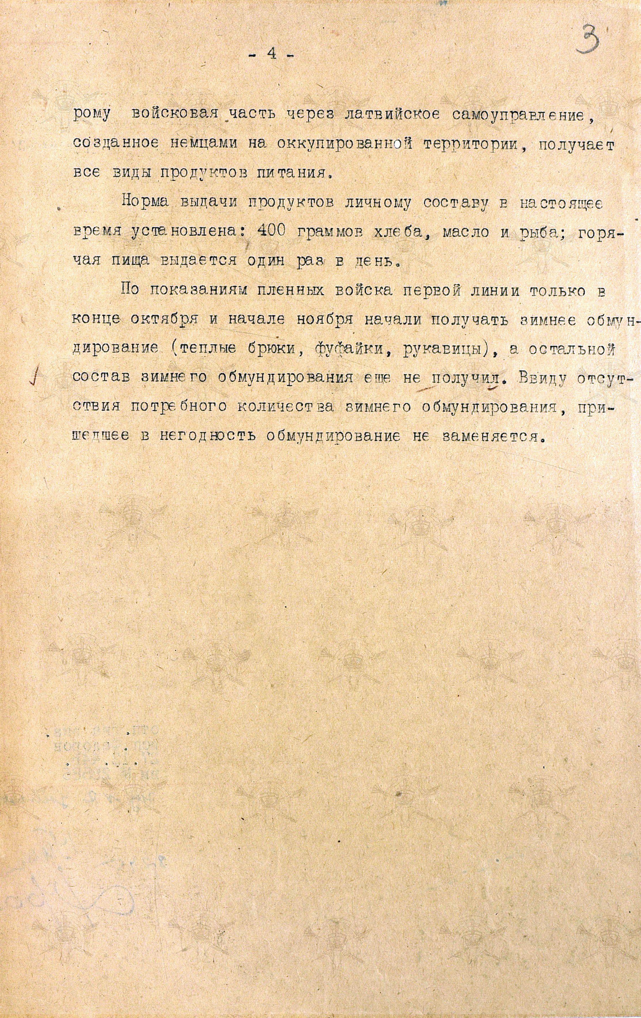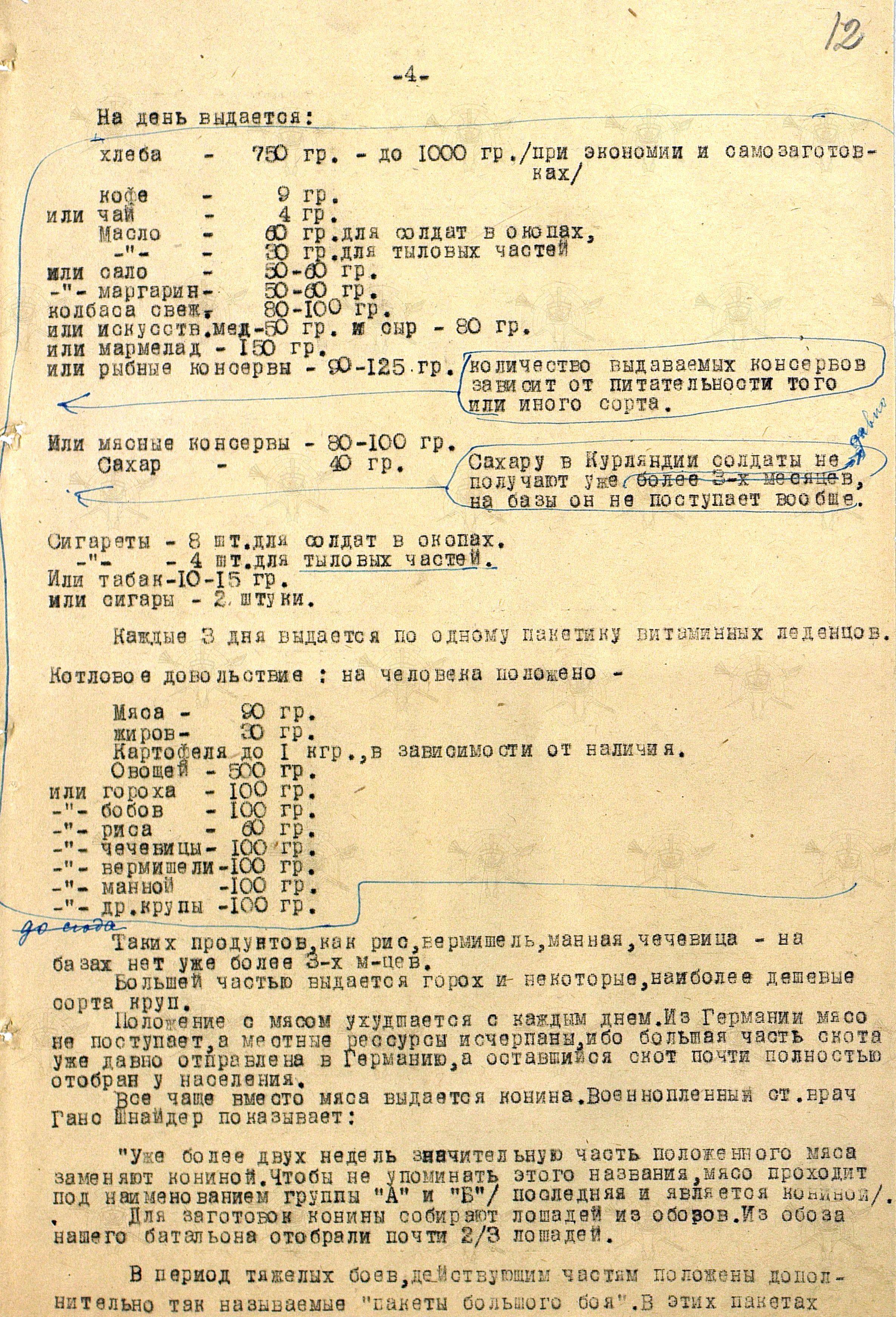 Небольшое объяснение по поводу вычеркнутых абзацев и сносок, наподобие: «последнее сообщение является весьма сомнительным», или «сообщение о хорошем питании - сомнительное». Дело в том, что материал, подготовленный Управлением тыла 2-го Прибалтийского фронта, предназначался для опубликования в Сборнике по обобщению опыта войны. Посему редактору, работавшему с документом, требовалось сократить текст и убрать из него все сомнительные утверждения. Так что перед нами обычные редакторские правки, для статей - вполне обыденное дело. Сотрудники Отдела обобщения опыта войны могли написать и отрицательную рецензию, а то и вообще вернуть материалы на доработку, в делах встречаются и такие пометки.