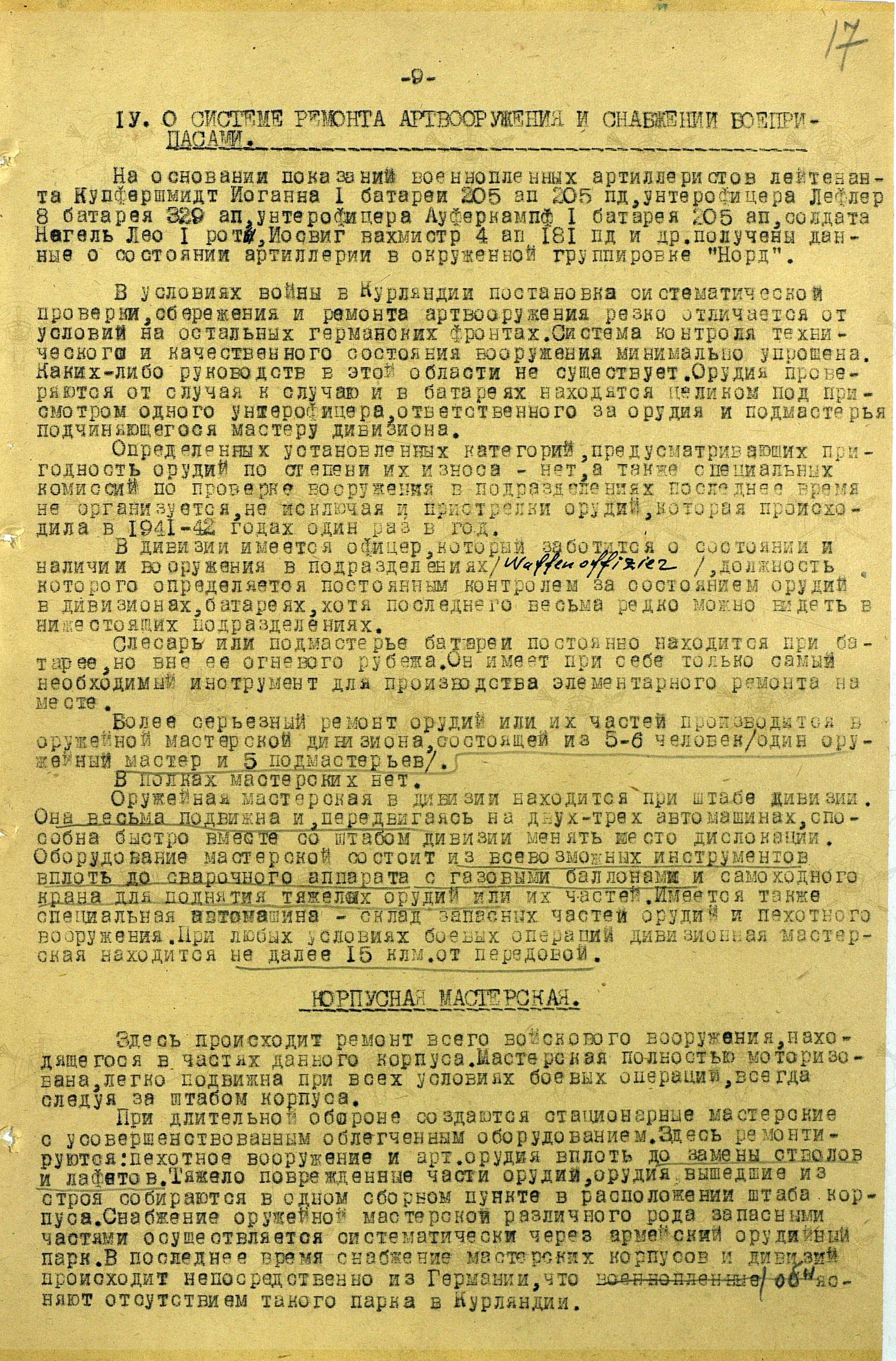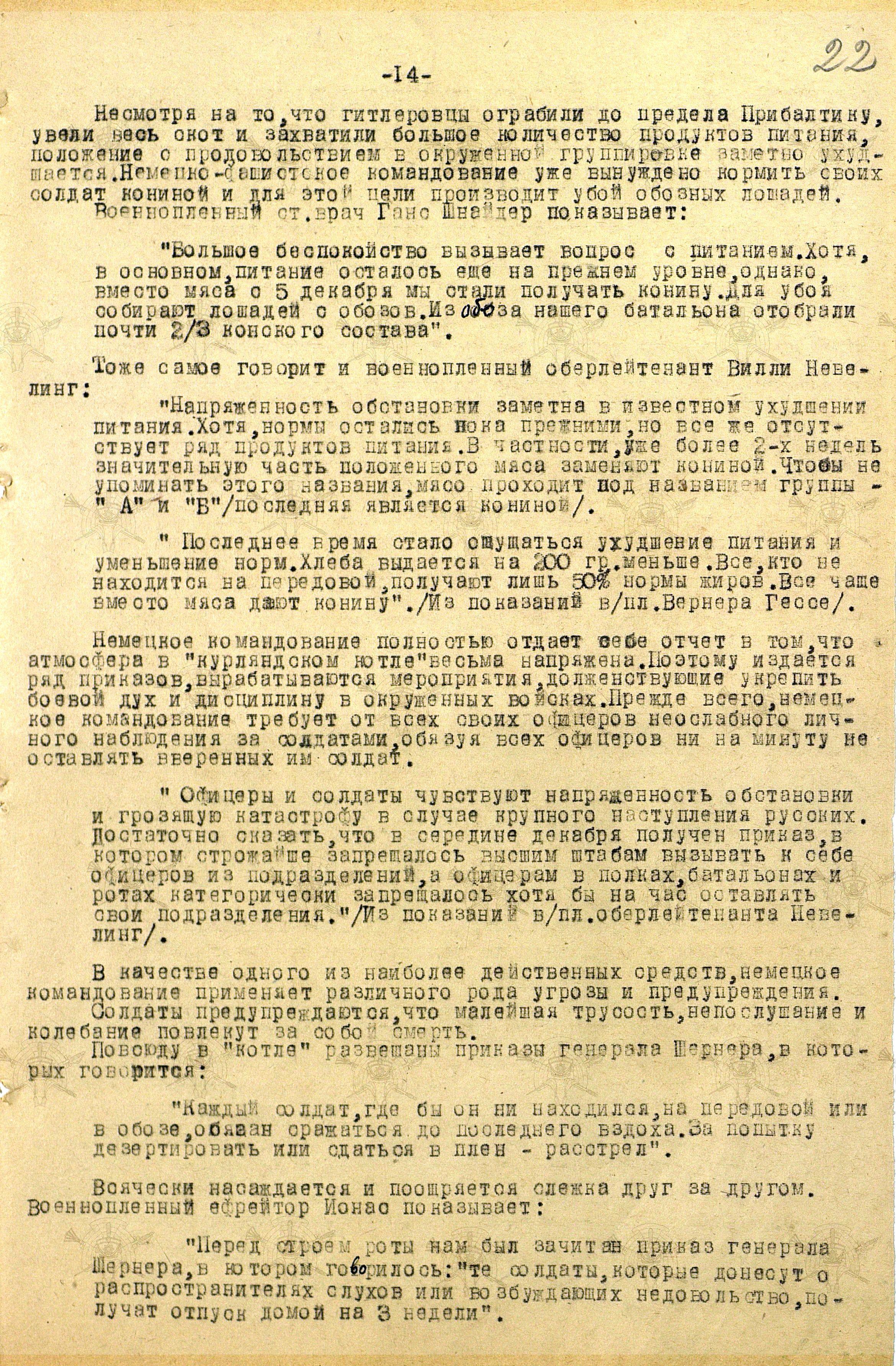 «Кроме того, важным моментом, который по мысли немецкого командования, должен укрепить стойкость и боевой дух войск в Курляндии является систематическое и неуклонное стремление полностью укомплектовать состав войск данной группировки из уроженцев Восточных районов Германии, которые должны с особым упорством защищать границы от наступающих Советских войск.