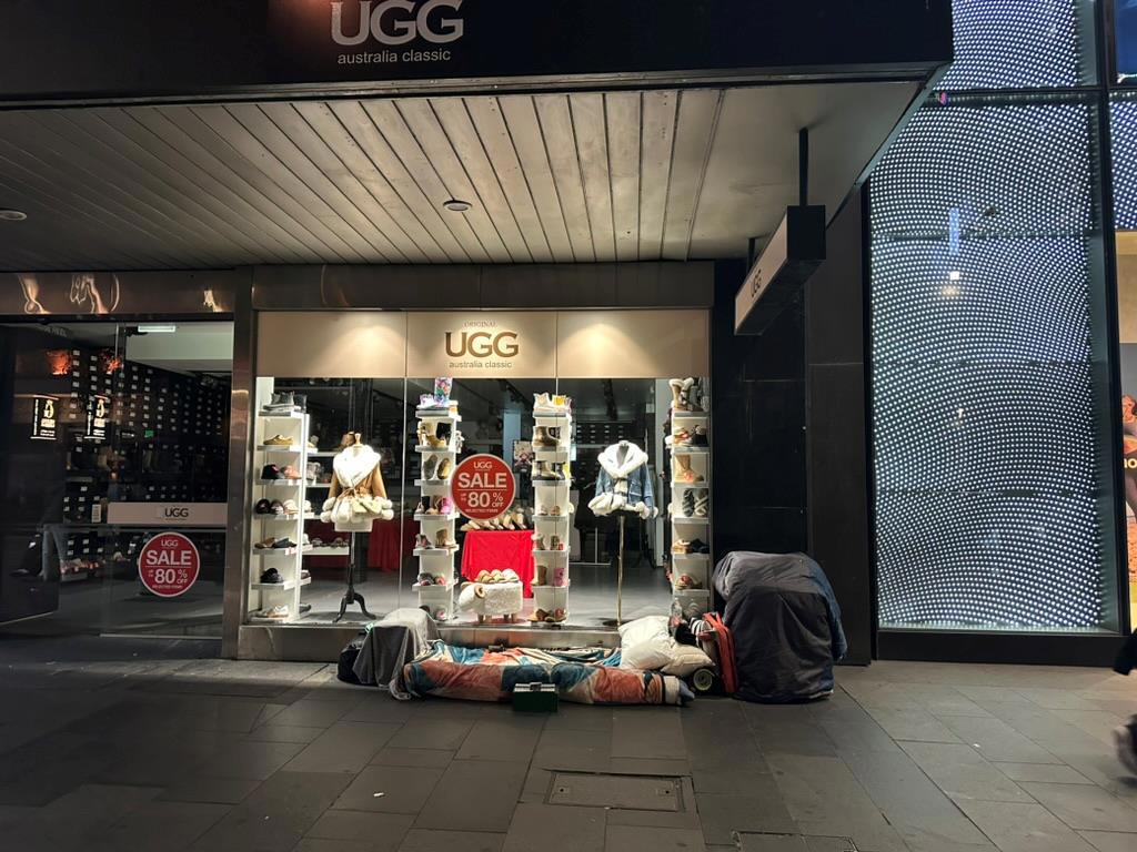 Но это точно не про Сидней. На асфальте никто не спит, у всех матрац, у многих простыня и подушки с наволочками. И никаких совместных ночевок, ночь – не для общения! Одна женщина с внешностью школьной учительницы, уже в пижаме, аккуратно расправляла складки на своей простыне, потом улеглась и открыла толстую книгу. Бородатый двухметровый хлопец лет тридцати разложил свою постель перед ярко освещенной витриной и тоже что-то с интересом читал.