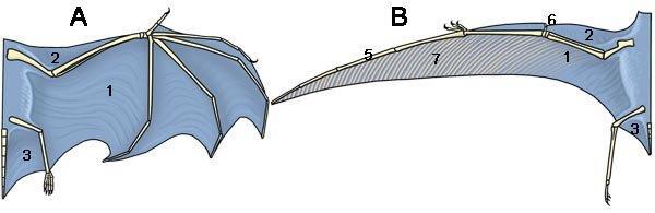 Если же мы посмотрим на крыло птерозавра, то там перепонка натянута между, всего лишь, одним пальцем и телом: