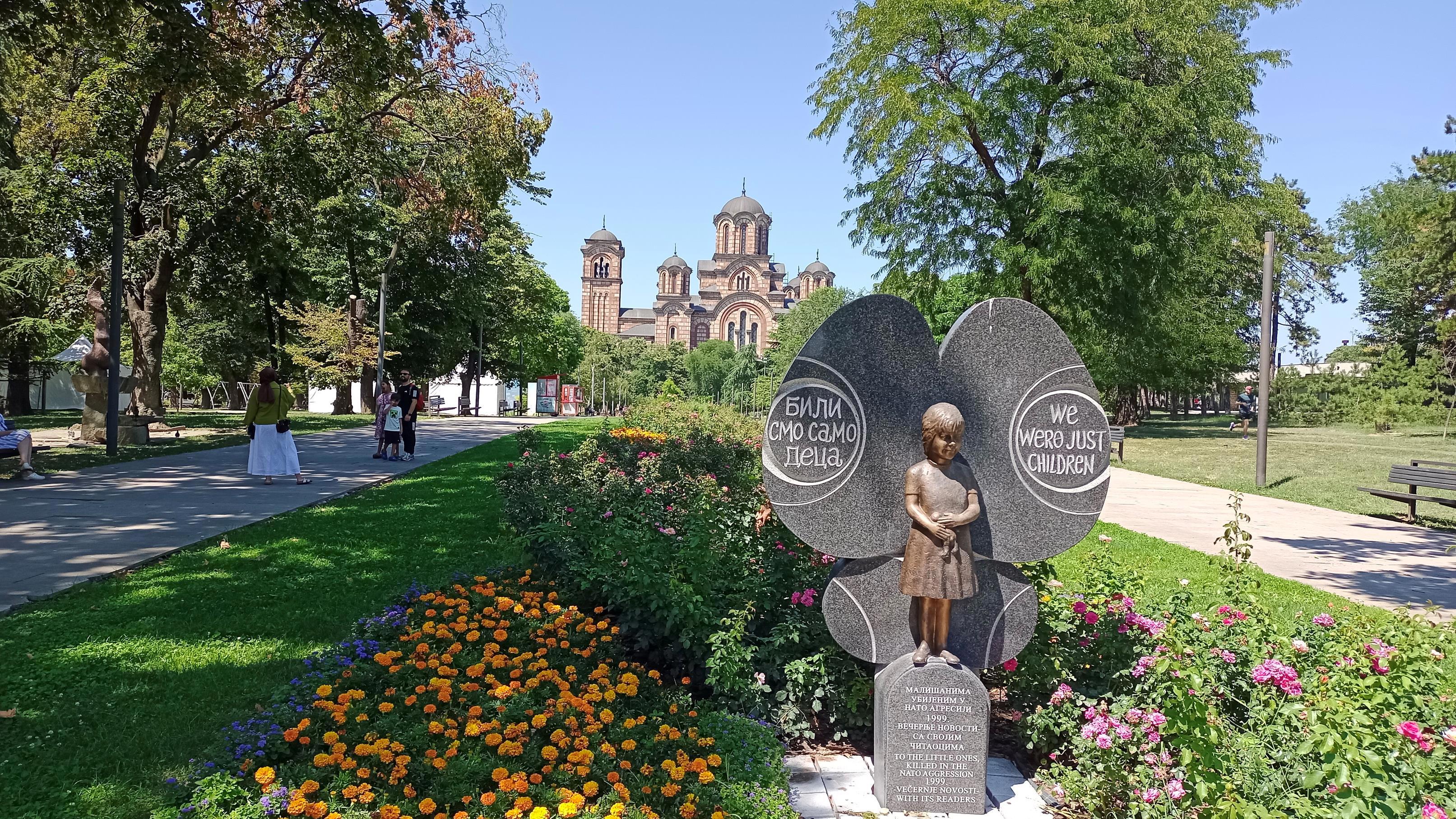 Храм святого Марка вдалеке, на переднем плане - памятник детям, погибшим во время натовских бомбардировок 1999 года