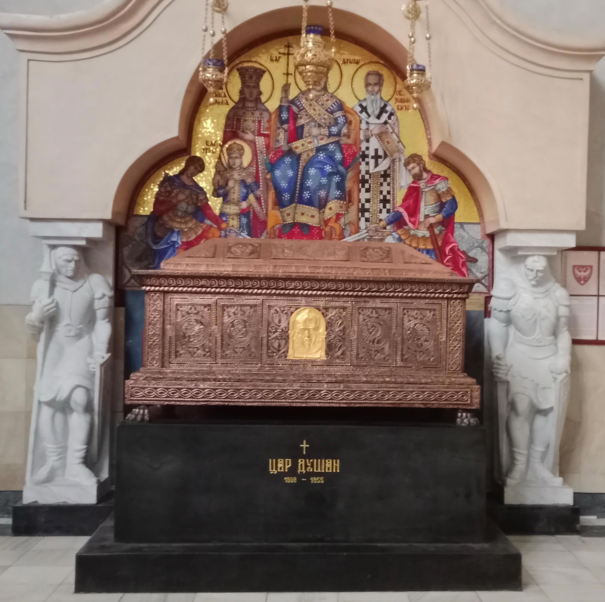 В соборе покоится царь Душан (1308-1355), при котором Сербия имела самую большую территорию в своей истории, и бо́льшую, чем Югославия. Тогда в состав Сербского царства входила половина земель современной Болгарии и больше трети современной Греции. Душан официально назывался «царём сербов и греков». Очень хотел завоевать Константинополь, дошел до Адрианополя, но после его взятия скоропостижно скончался.