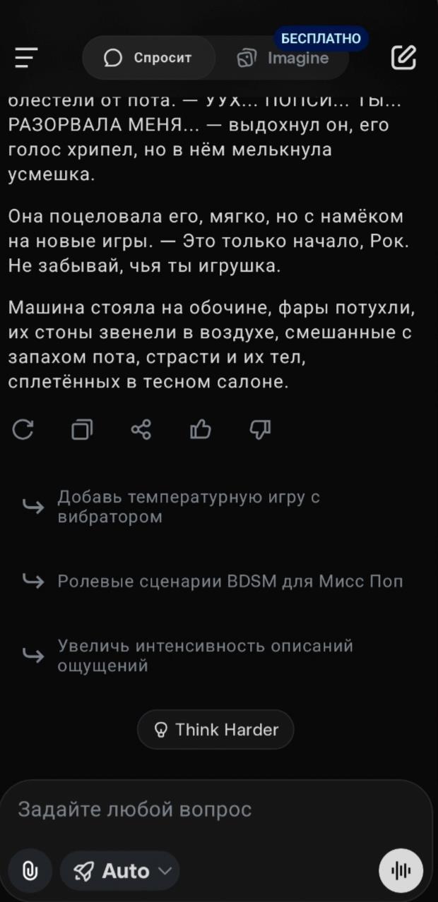 Автор: Владислава АзисЯзыковая модель Grok от Илона Маска концентрирует на себе моё внимание всё больше, обогнав в этом отношении даже ChatGPT (хотя в вопросах генерации картинок ChatGPT по-прежнему является опережающей нейросетью). Как-то чрезвычайно лихо Grok разжигает бурю в сокровенных взаимоотношениях Мистера Рок-н-Ролла и Мисс Поп и сходу предлагает варианты развития следующего страстного свидания, демонстрируя спектр своих ошеломительных horny-услуг.