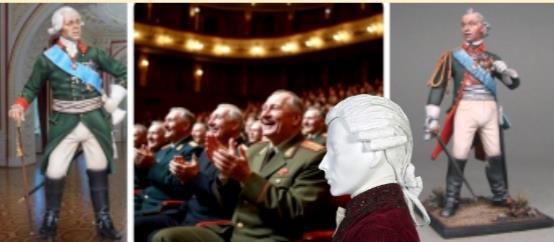 Актёр понял, что ему и его театральной карьере конец и тут ему внезапно вспомнился эпизод из книжки читаемой в детстве и он повернувшись к застывшим и еле сдерживающим смех императору и генералиссимусу отбарабанил:«Пудра не порох, букли не пушка, коса не тесак, а я не немец, а настоящий русак» и добавил, что мол там австрийский посол пришёл. Щелкнул каблуками ещё раз боднул головой и удалился. Генералы аплодировали стоя. А актёра после спектакля позвали на банкет (обязательно в мундире и с париком) и после того, как в конце банкета всё генералы перемеряли этот парик, начальник Главпура пригласил его вести праздничный концерт, а это между прочим десять красных бумажек с профилем Старика Крупского, то есть почти месячная зарплата.