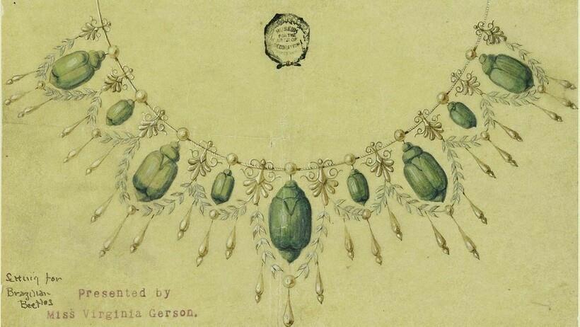Самым распространенным был жук: тельце часто из нескольких драгоценных камней, а золотые или серебряные лапки свисали по краям. А на смену пришли украшения из... настоящих жуков. Для них делали небольшие клетки, куда и помешался жук. Клетка , как и брошь, крепилась на платье. Впрочем, бездыханные насекомые, особенно редкие, также пользовались популярностью. Например, вот эти, африканские: